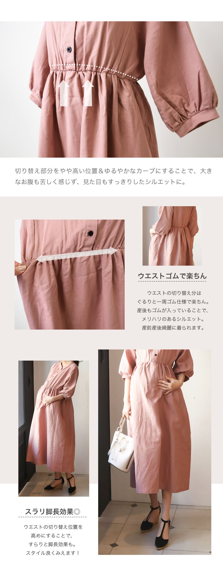 「マタニティの大きなお腹でも楽ちん&綺麗に着られる設計」