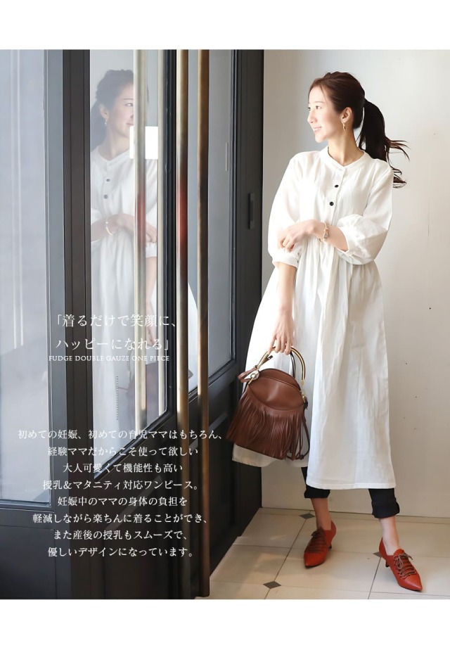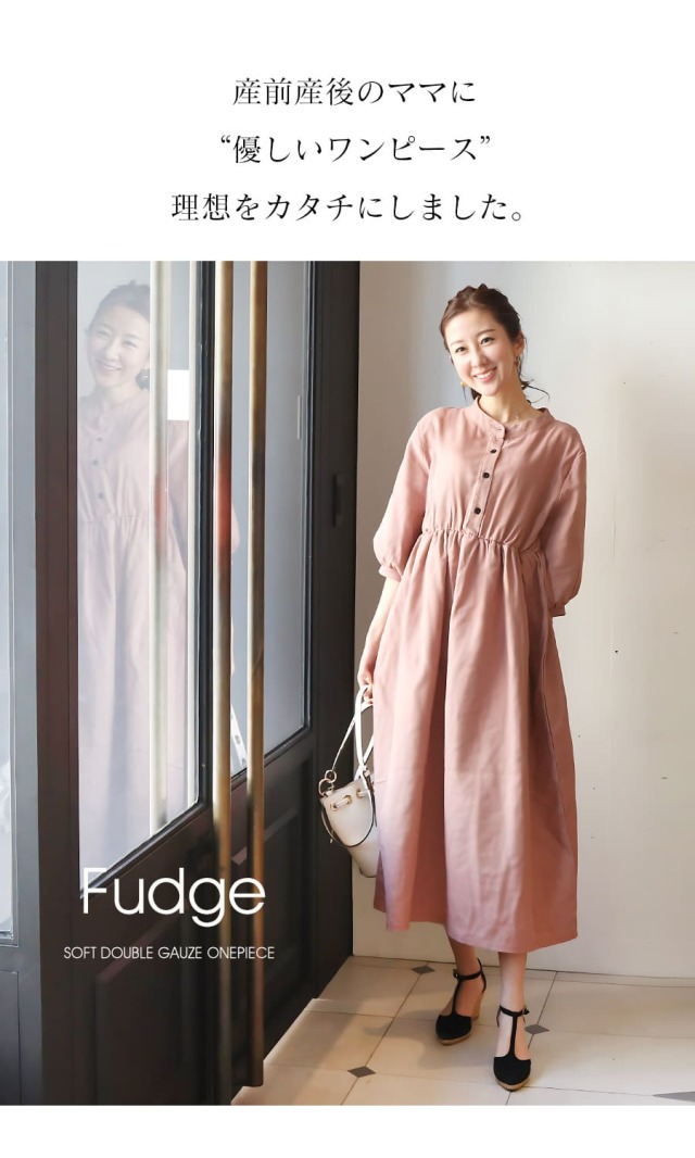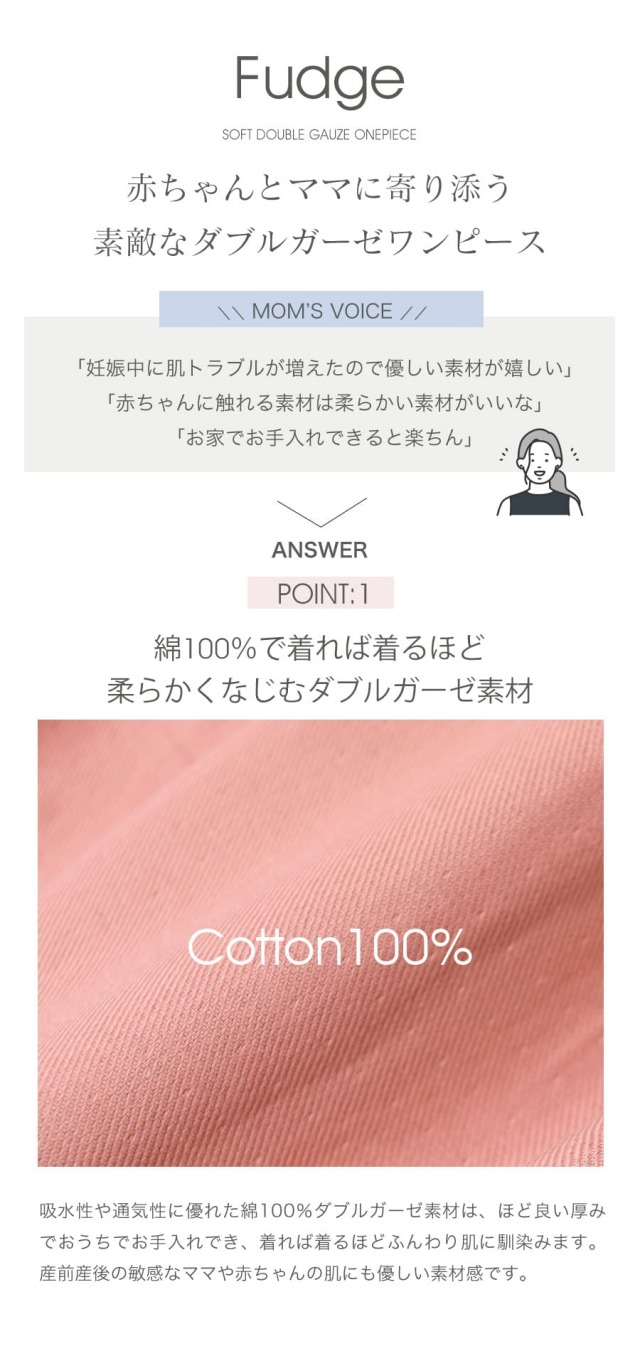 そんなママの身体に寄り添いながら、すこしでも笑顔で育児ができることを祈って作ったのが、ママにも赤ちゃんにも優しい「ファッジ・ダブルガーゼワンピース」です。