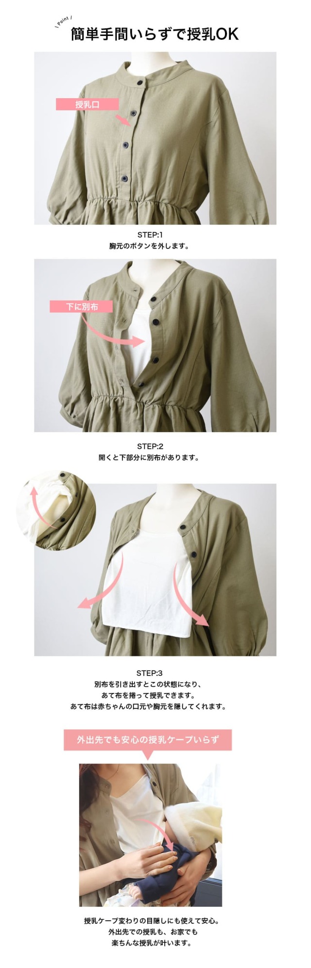 授乳が初めてのママでも扱いやすく、また外出先での授乳も授乳ケープなしで授乳できます。