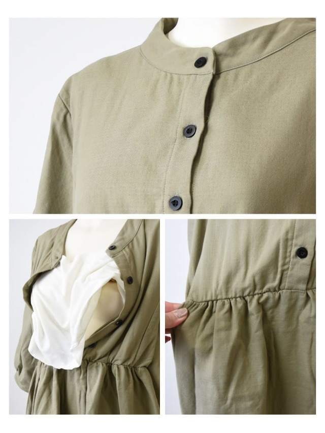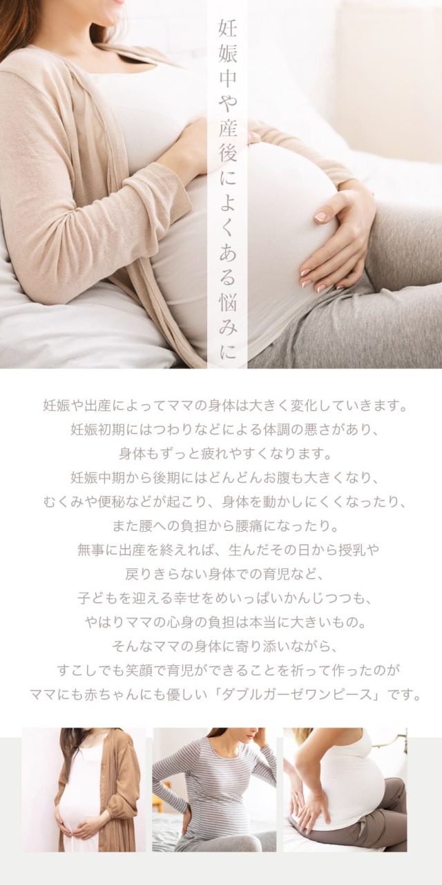 妊娠中のママの身体の負担を軽減しながら楽ちんに着ることができ、また産後の授乳もスムーズで、戻りきらない身体にも優しいデザインになっています。