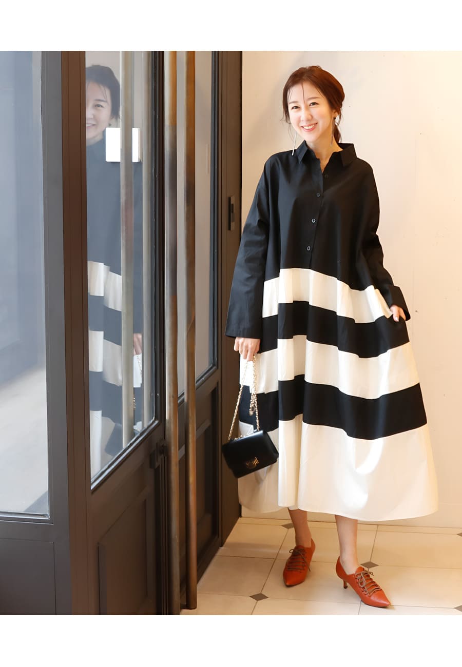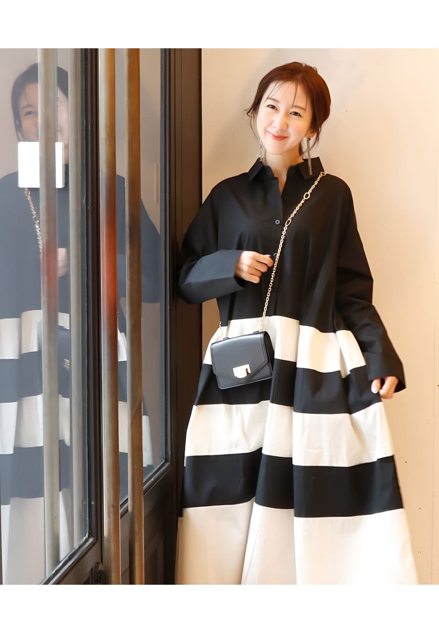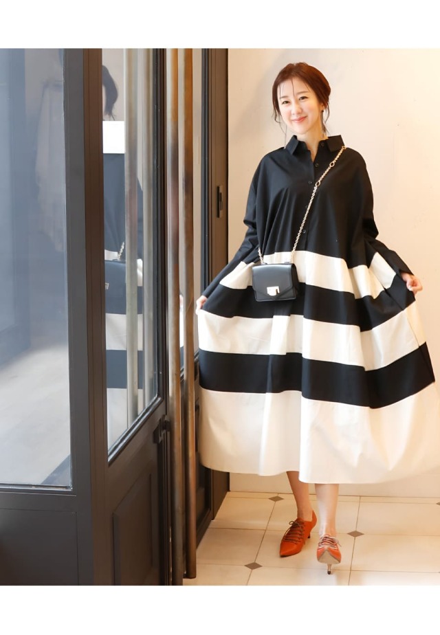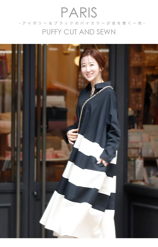 ●柔らかなアイボリーカラーとブラックのバイカラーで構成した、モノトーンが目を惹くアートな一着。