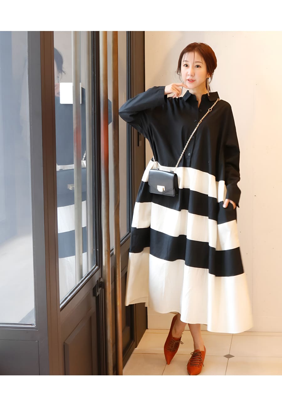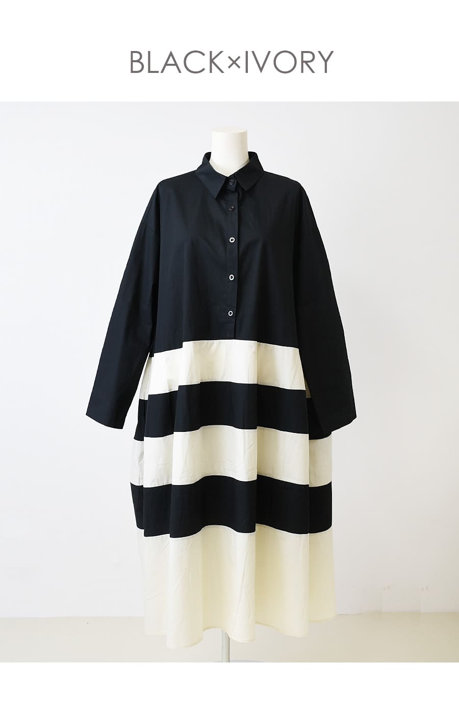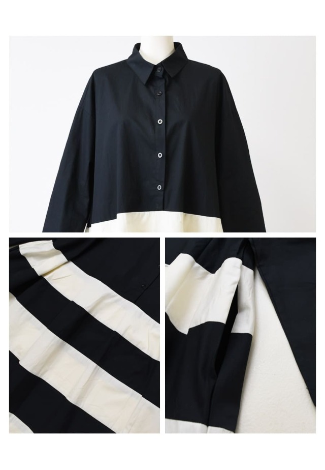 ●柔らかなアイボリーカラーとブラックのバイカラーで構成した、モノトーンが目を惹くアートな一着。
