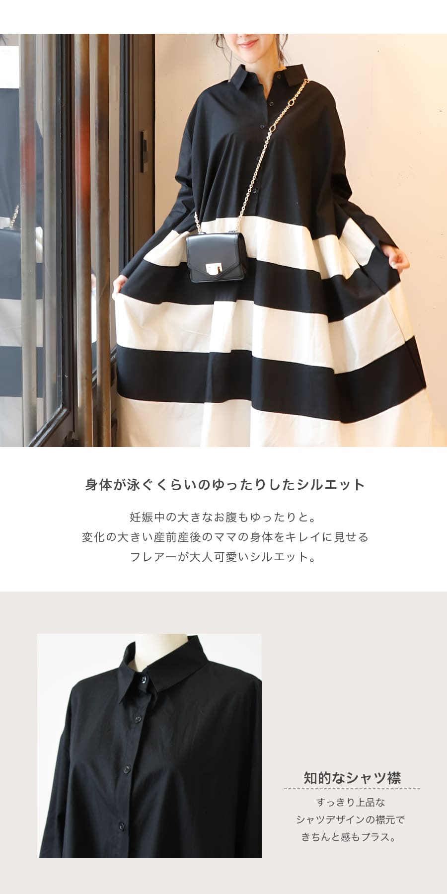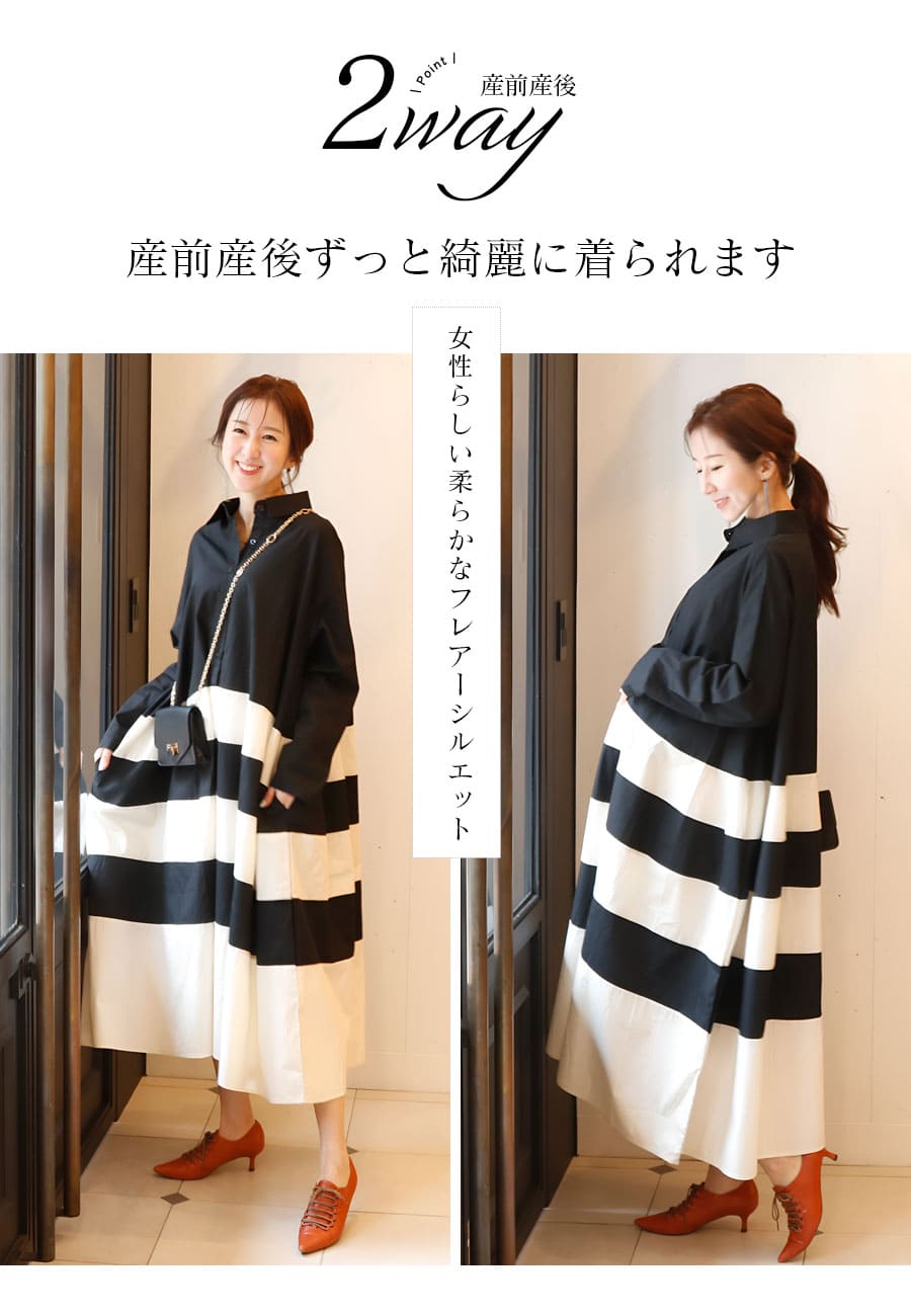 バイカラーで構成した、コットン100%の<授乳&マタニティ対応>フレアーシャツワンピースです。