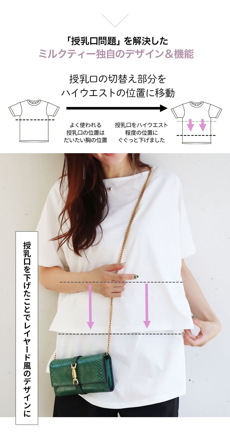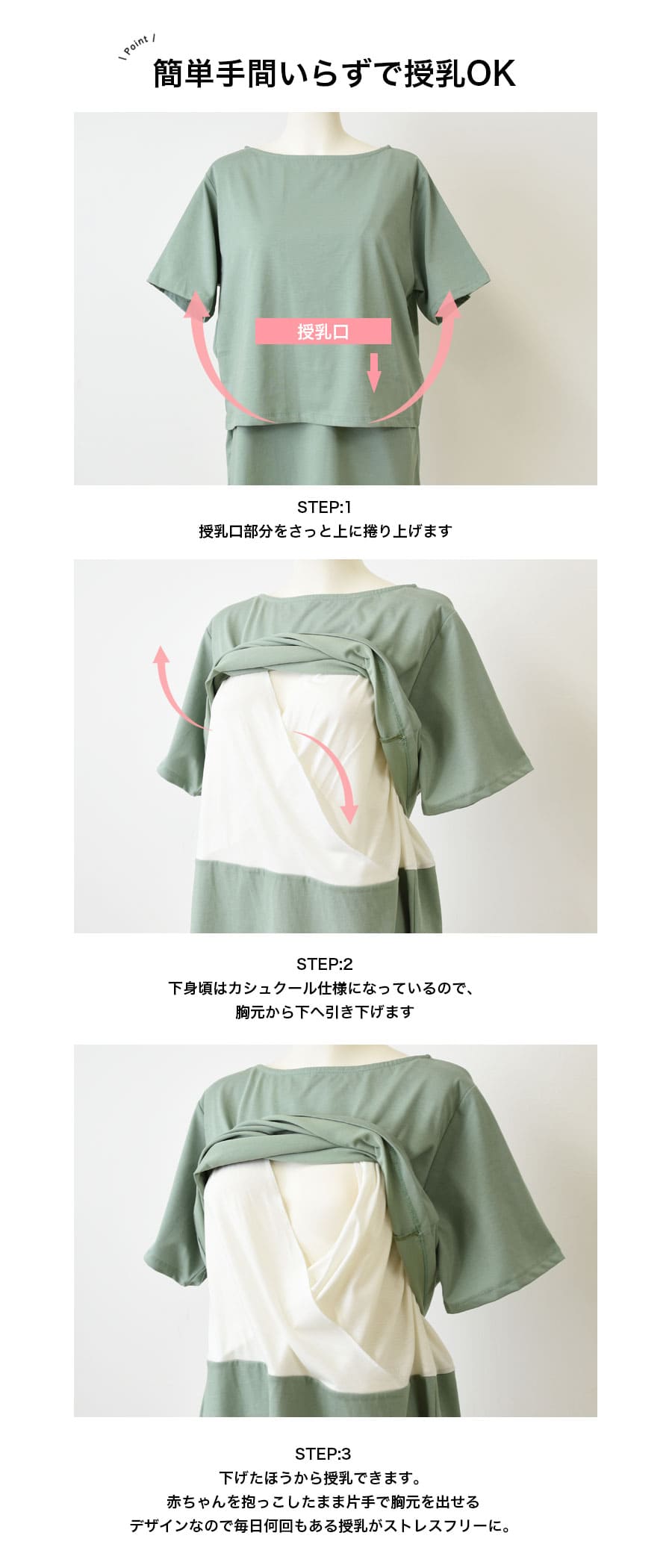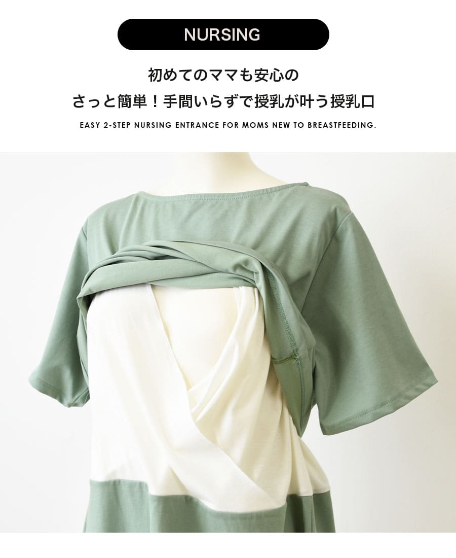 ●授乳簡単設計:前身頃を上げ、内側のカシュクール部分を下げるだけで授乳OK。初めての授乳でも安心。