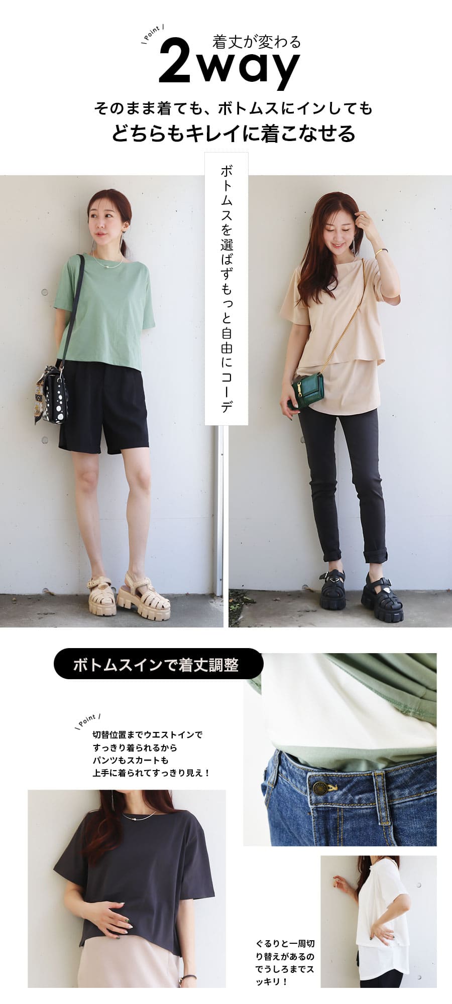 ●2WAY着丈:二重構造の見頃の下見頃をタックインすると着丈が2WAYに。ボトムスを選ばず着られて、すっきり着やすいデザイン。