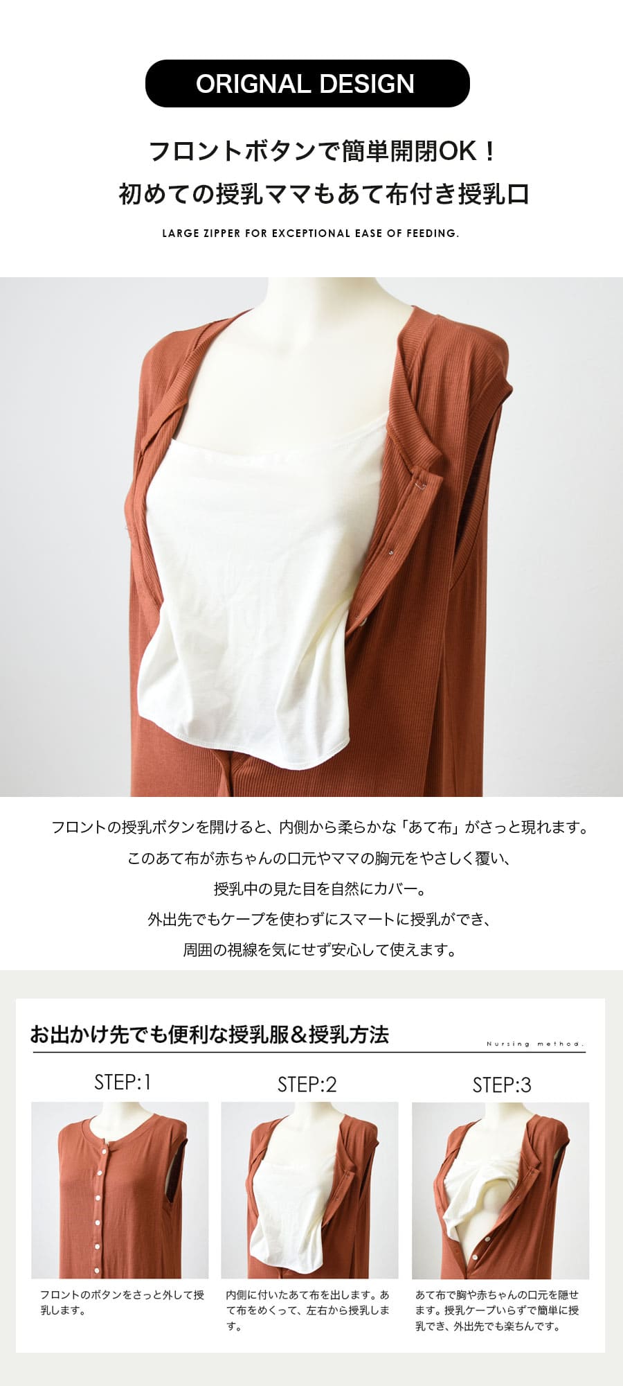 ●独自設計“あて布付き授乳口”:授乳中の胸元や赤ちゃんの口元をしっかりカバーし、ケープなしでも外出先で安心授乳。