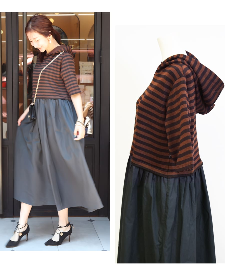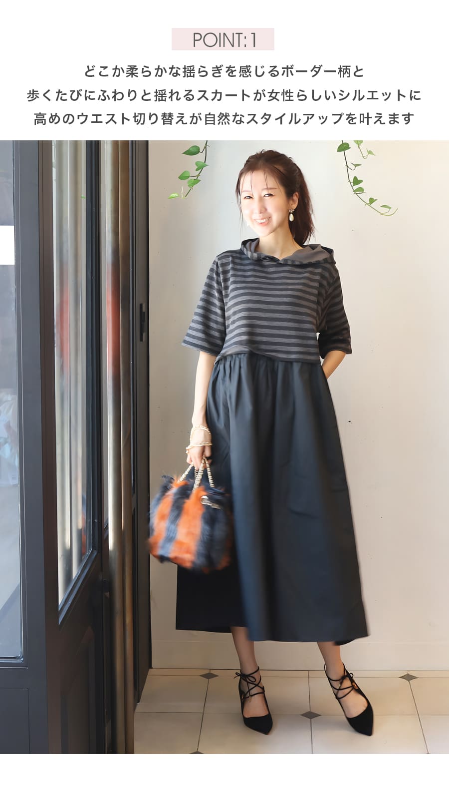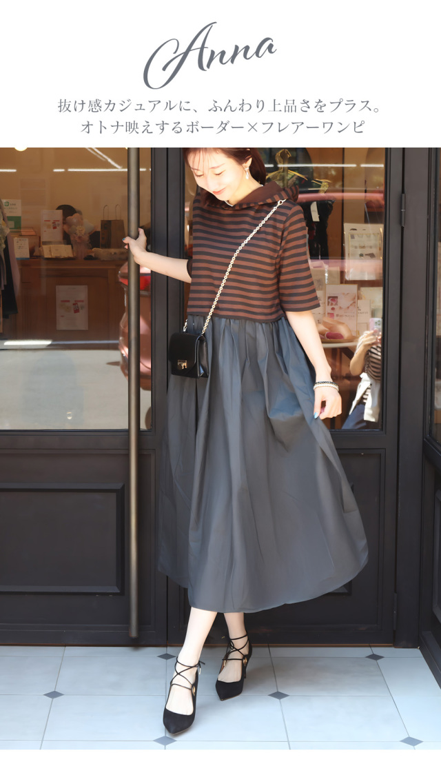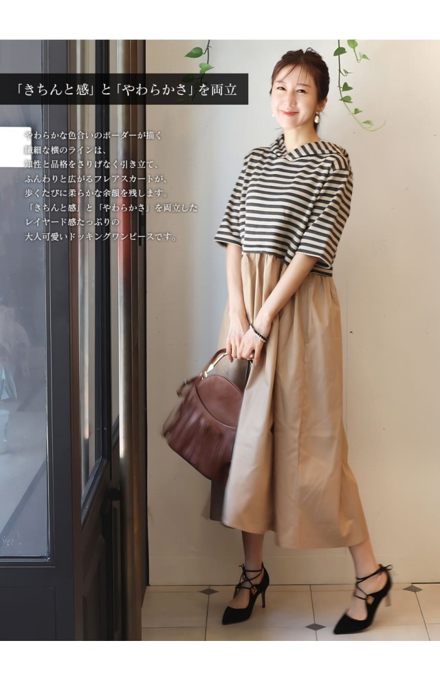 繊細なボーダーと軽やかなフレアスカートで「きちんと感」と「やわらかさ」を両立したレイヤード感たっぷりのドッキングワンピースです。