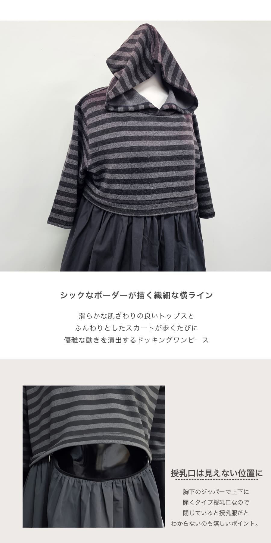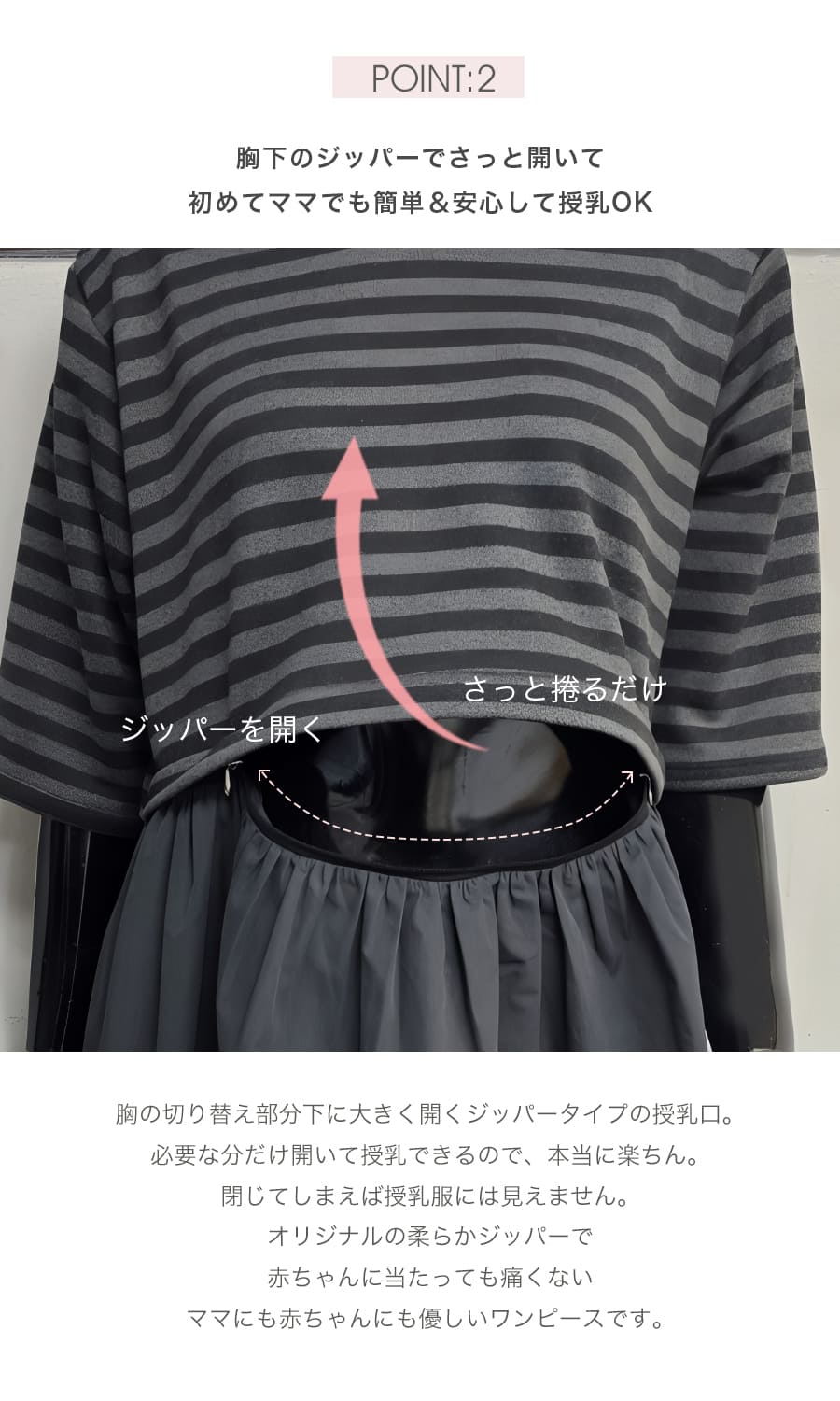 前身頃の切り替え部分につけたジッパータイプの授乳口は、左右に大きく開くのでとても授乳しやすいと授乳初めてママにも評判のデザイン。