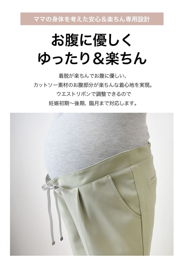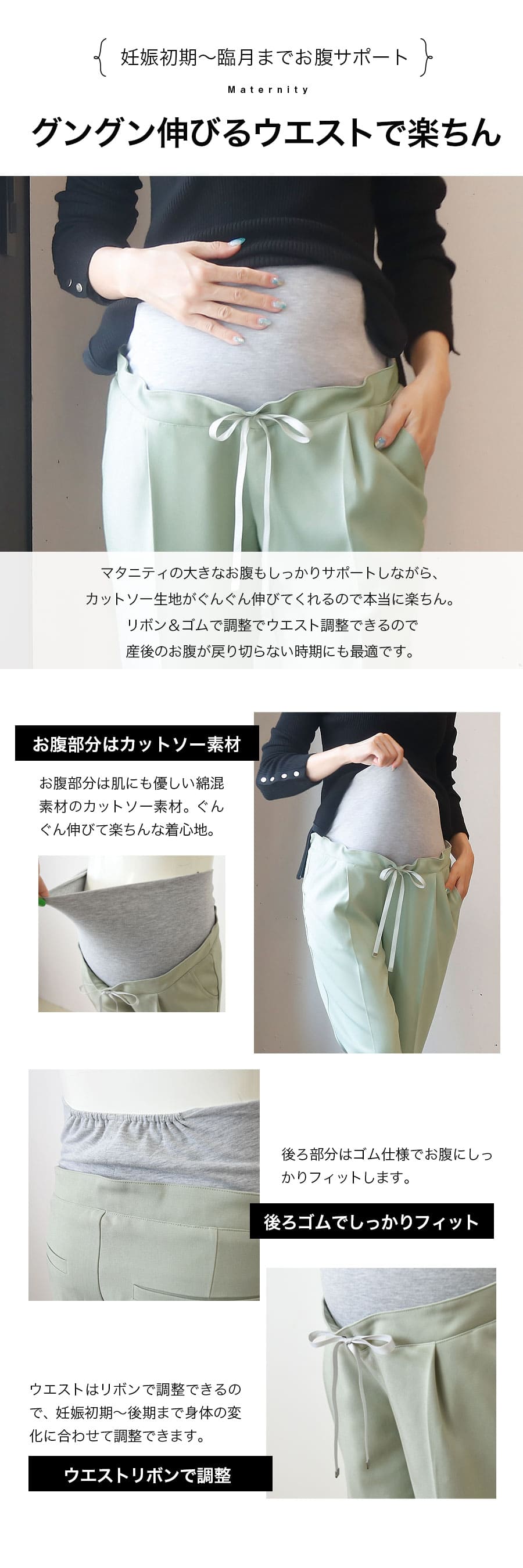 ●ウエストはリボン&ゴム仕様で調整可能、妊娠中〜産後まで長く使える。