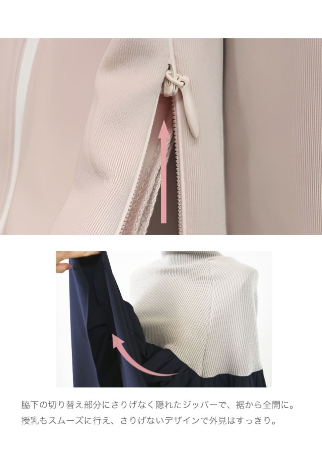 ●脇下の切り替えジッパーで裾から全開、授乳ケープのように使える。