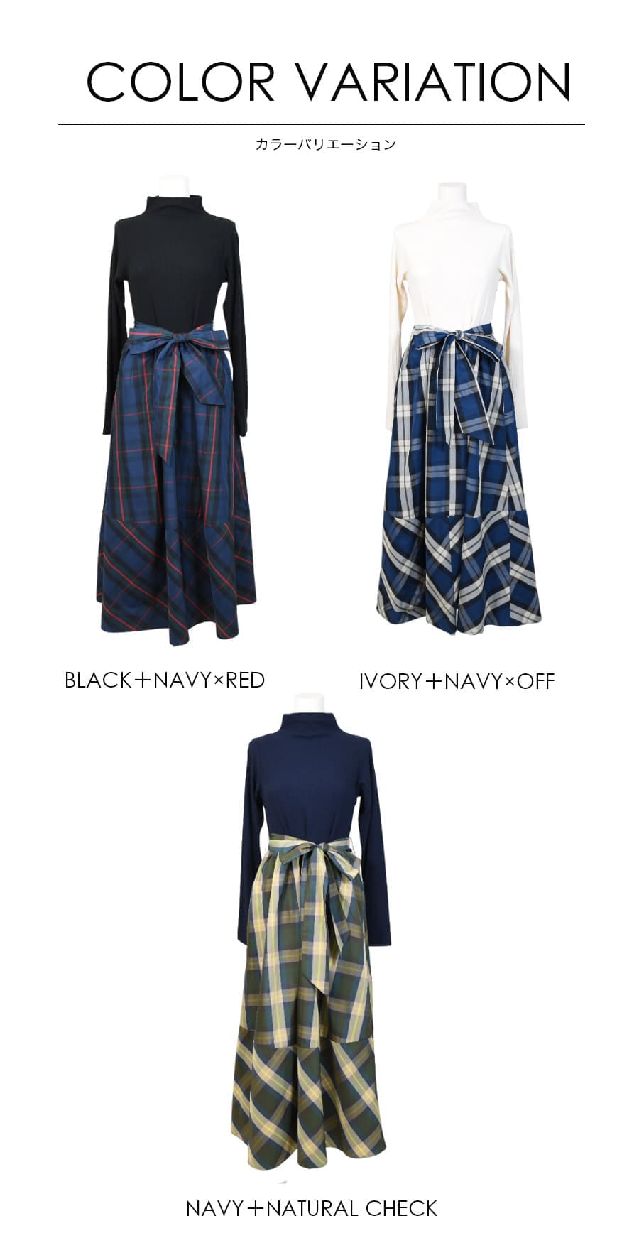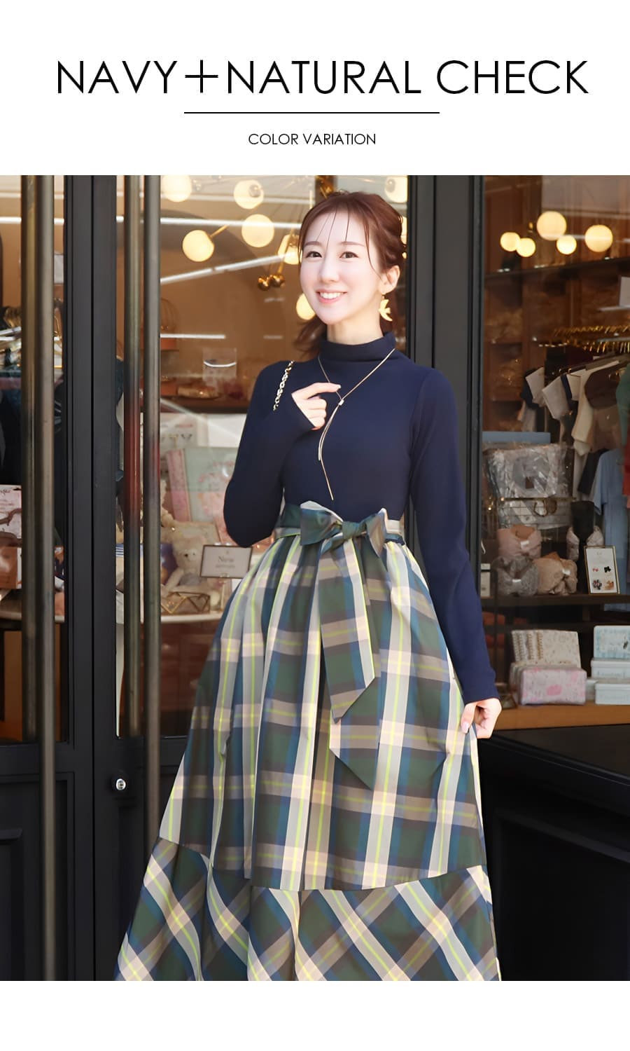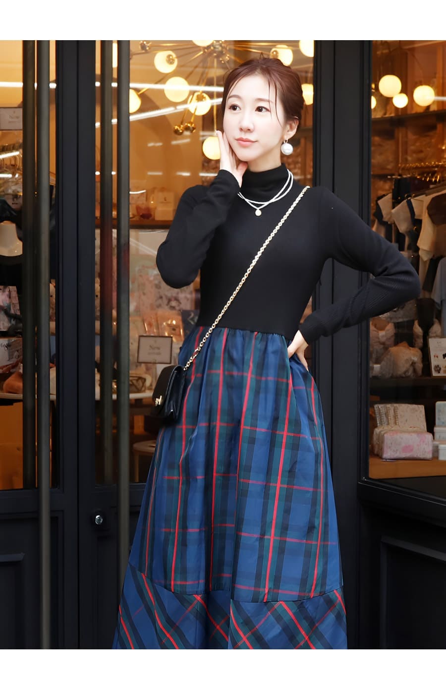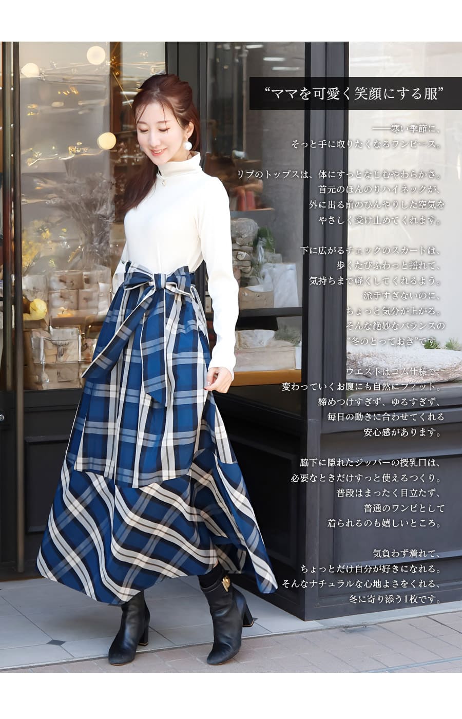 \大人の冬を華やかに仕立てる、リブ×チェックの洗練ドッキングワンピース/