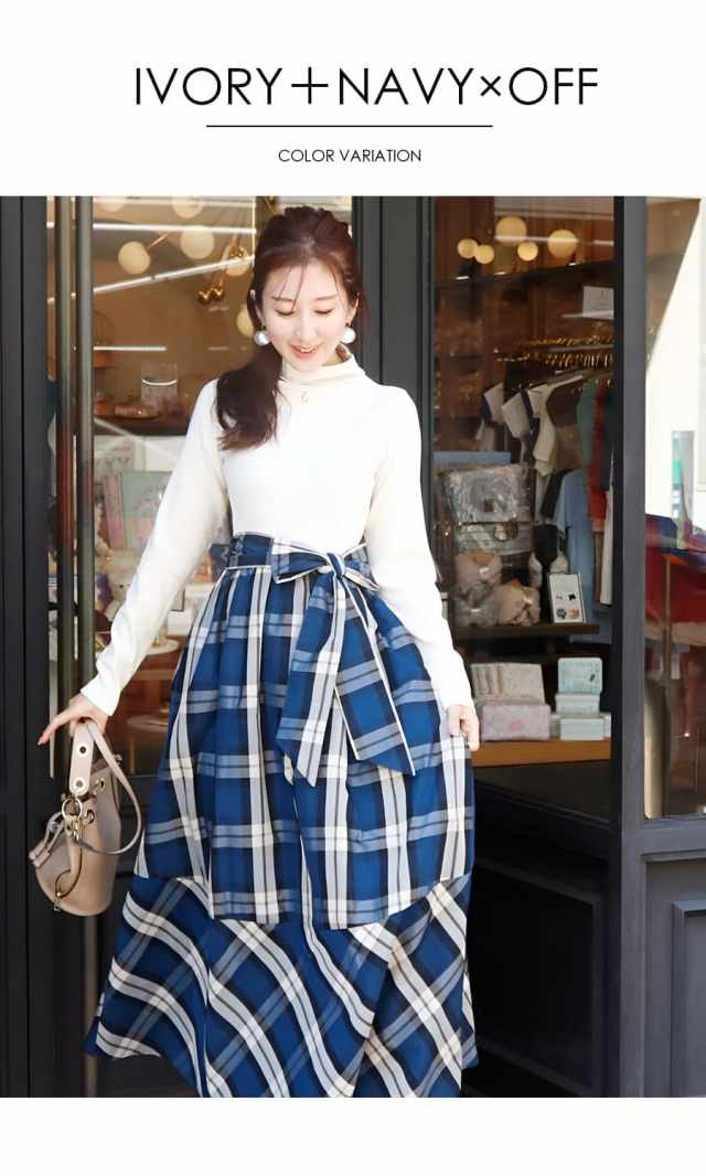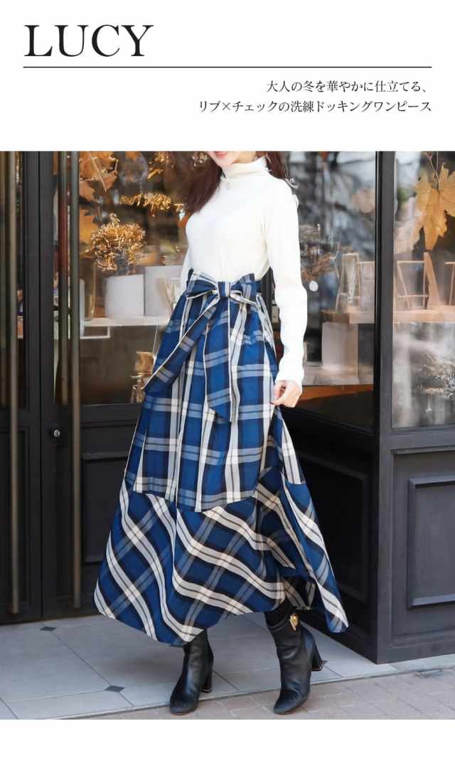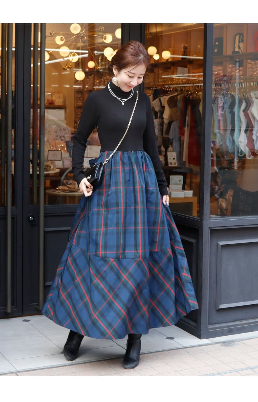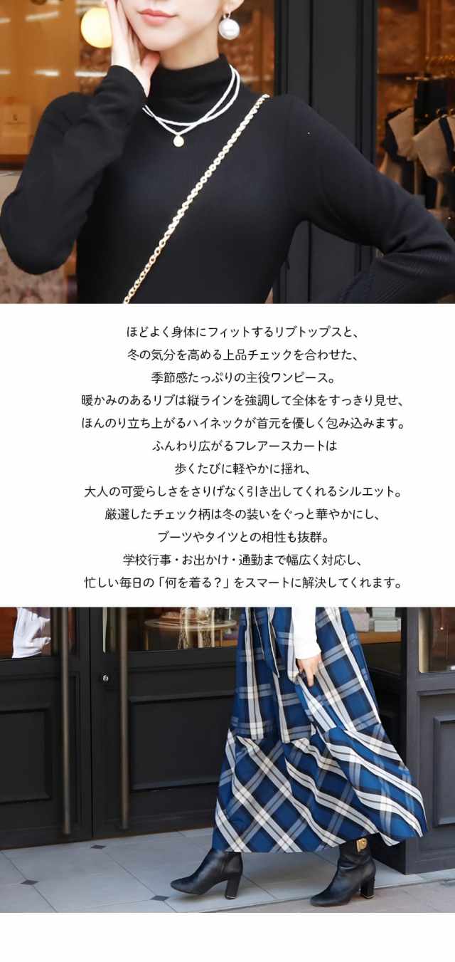 ほどよく身体にフィットするリブトップスと、冬の気分を高める上品チェックを合わせた、季節感たっぷりの主役ワンピース。