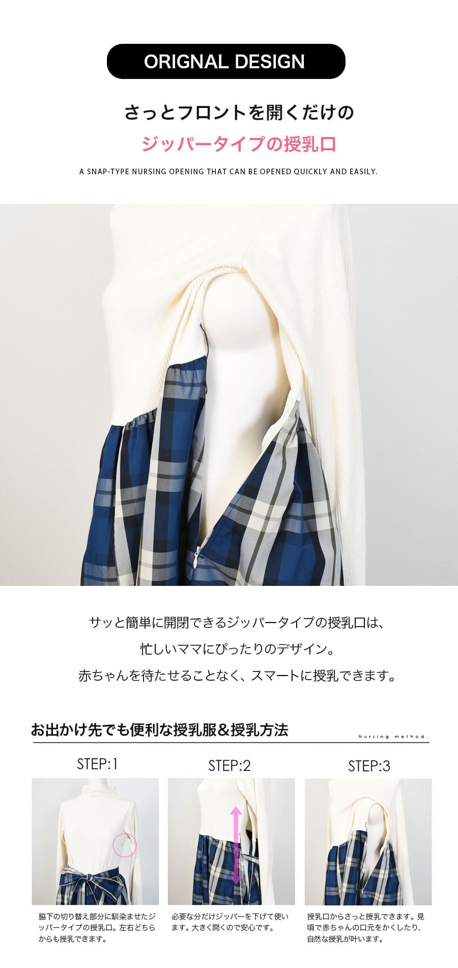 脇下の切り替えに自然に溶け込む“ジッパー授乳口”は、授乳服と気づかれないほどの美しい仕上がり。