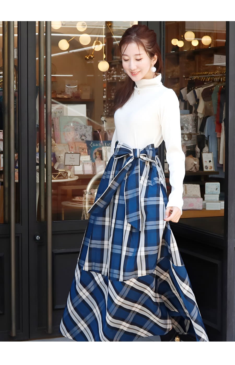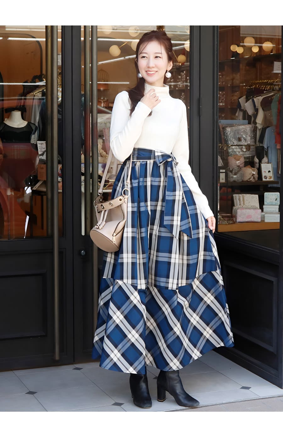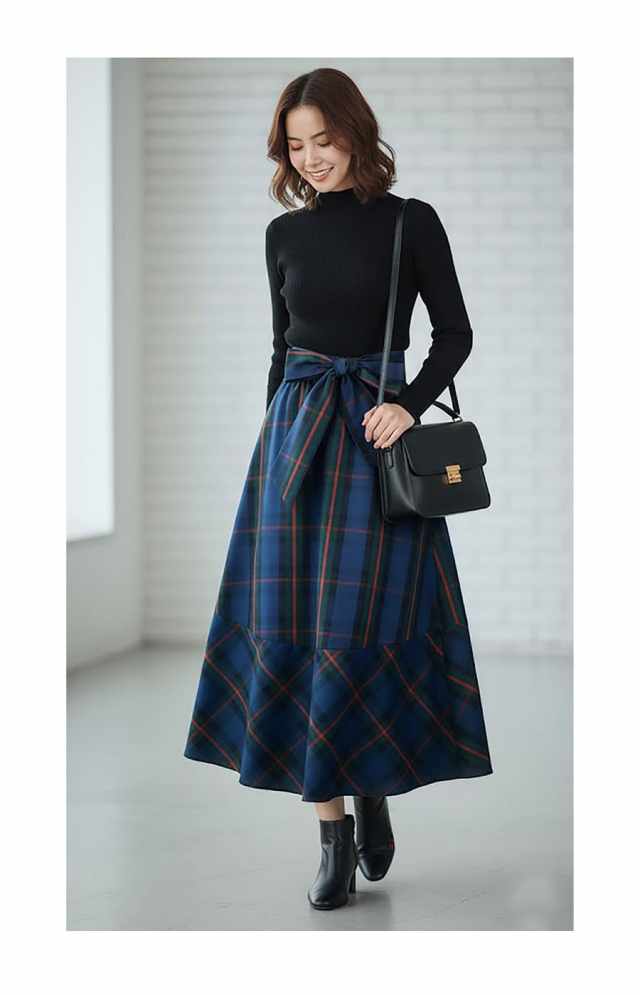 チェックフレアスカート:上品なチェック柄で冬のコーデに華やぎを添え、歩くたび軽やかに揺れるフレアライン。