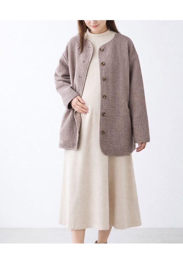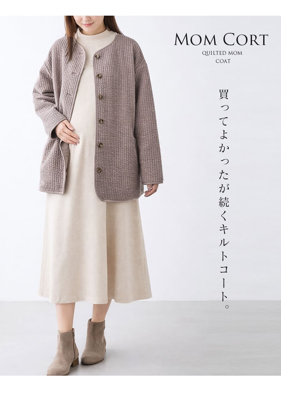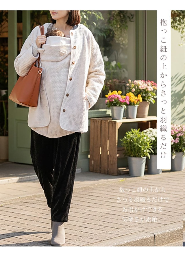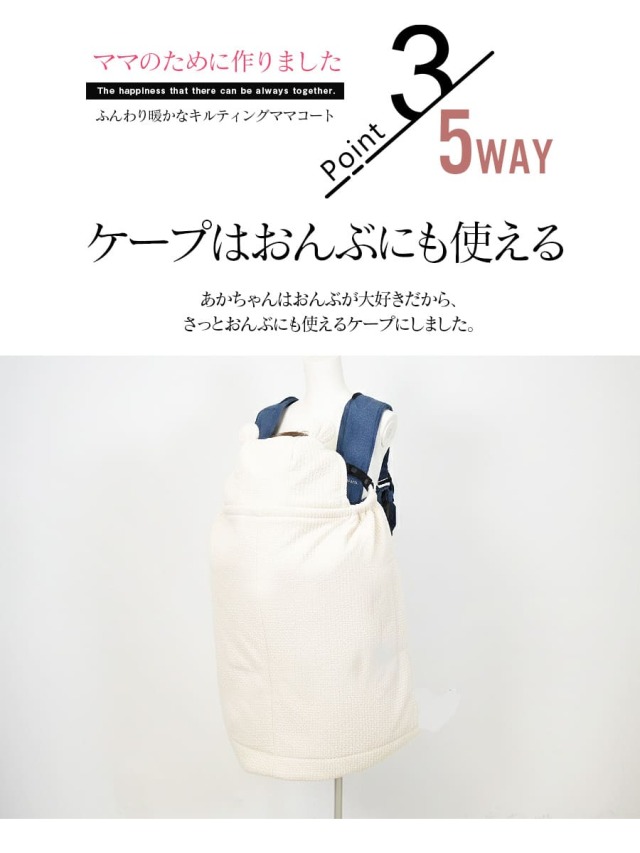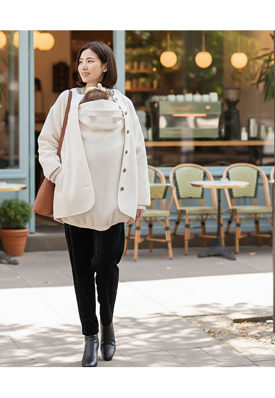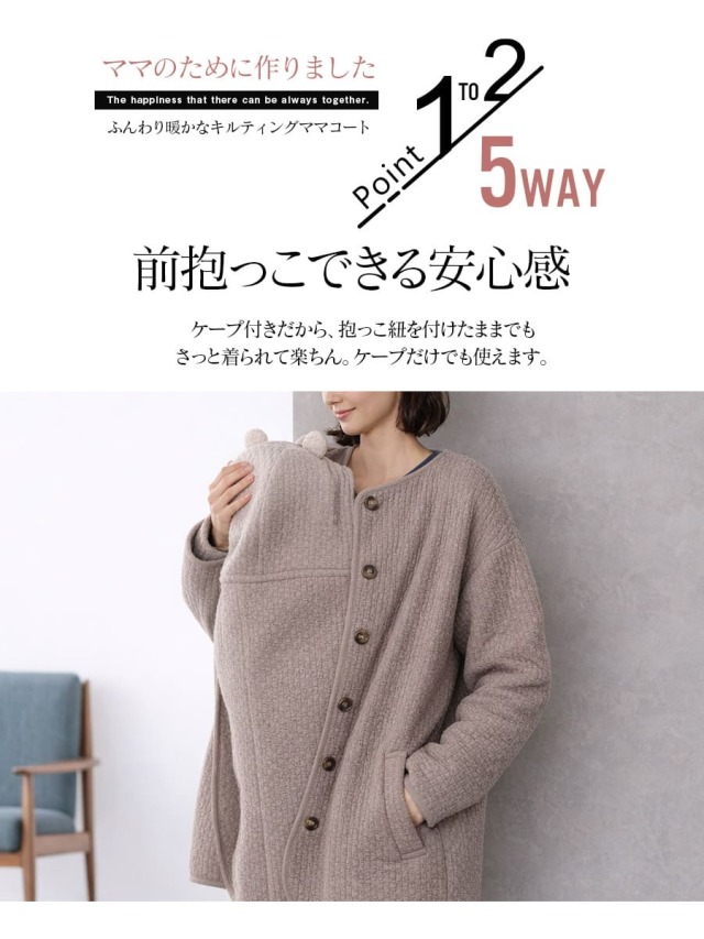 ふんわりとしたキルト素材が、ママとベビーをやさしく包み込むママコート。