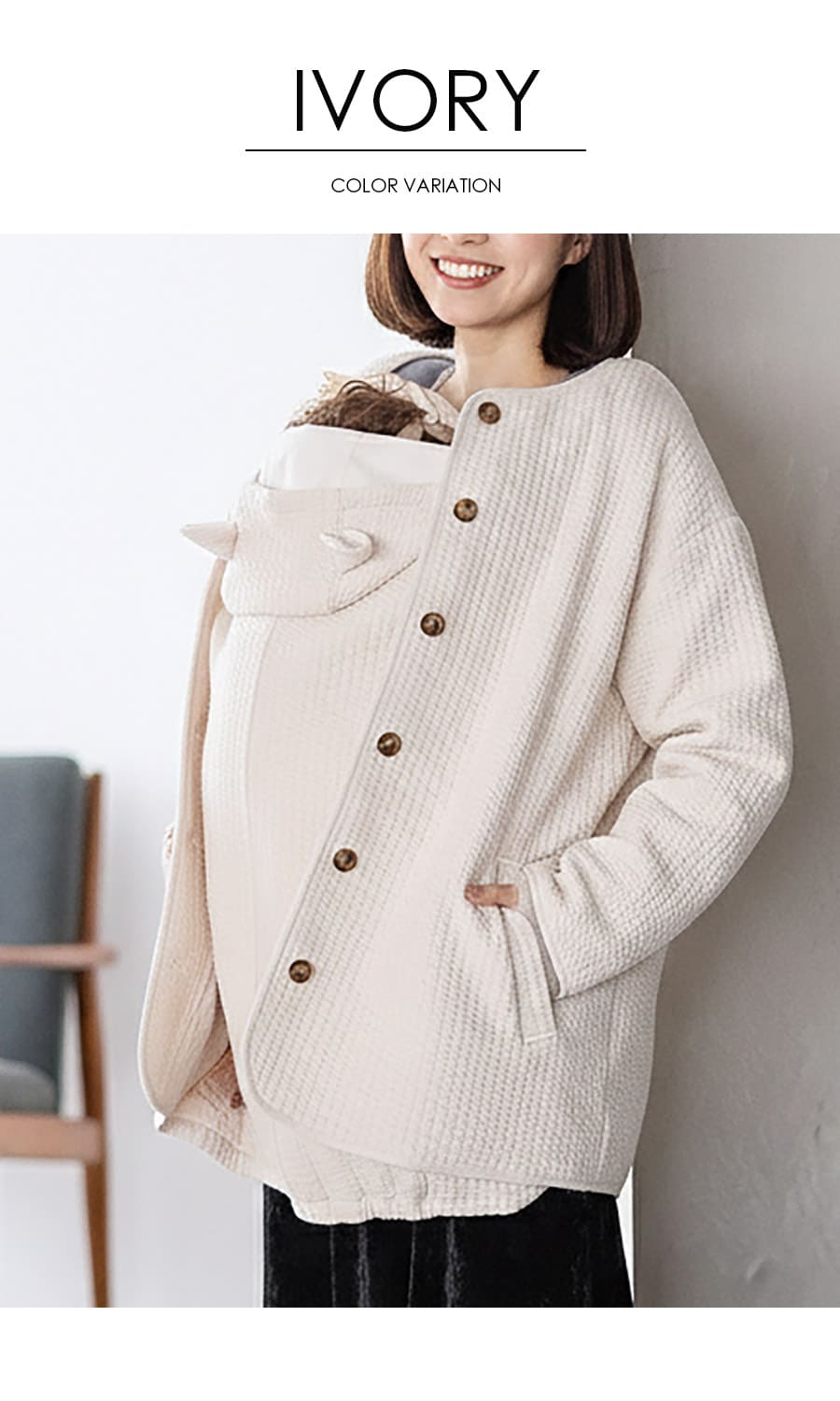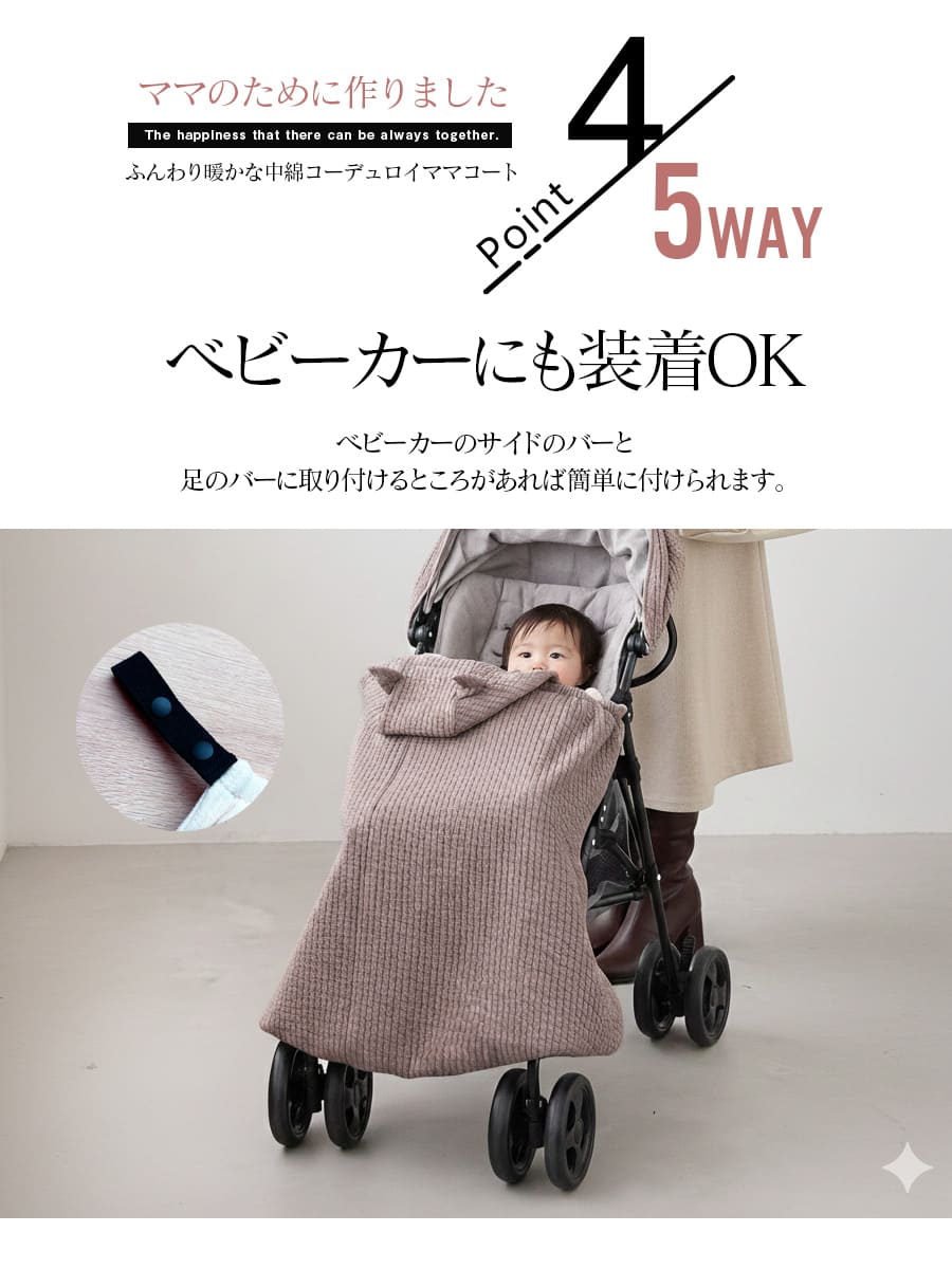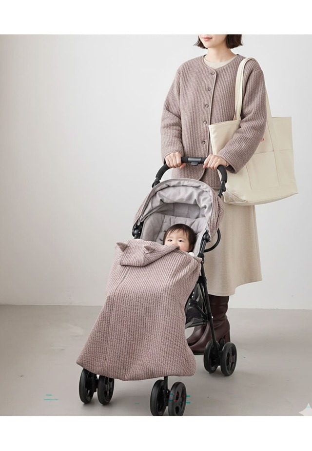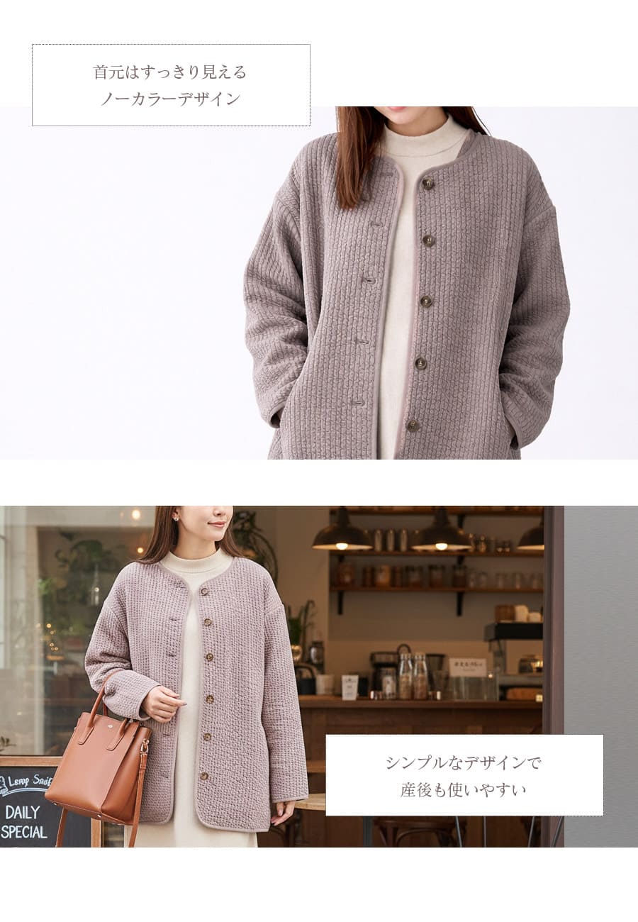 ふんわりとしたキルト素材が、ママとベビーをやさしく包み込むママコート。