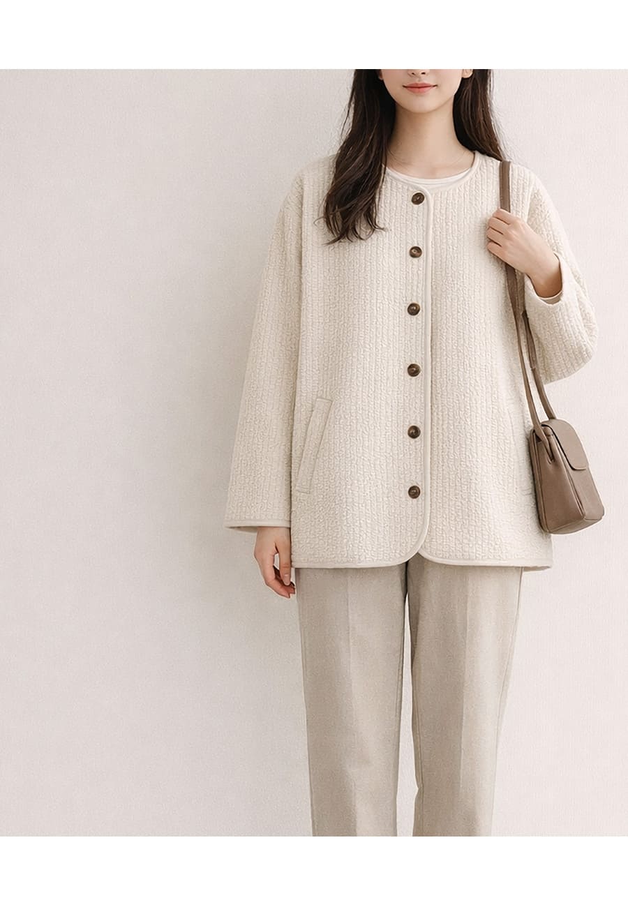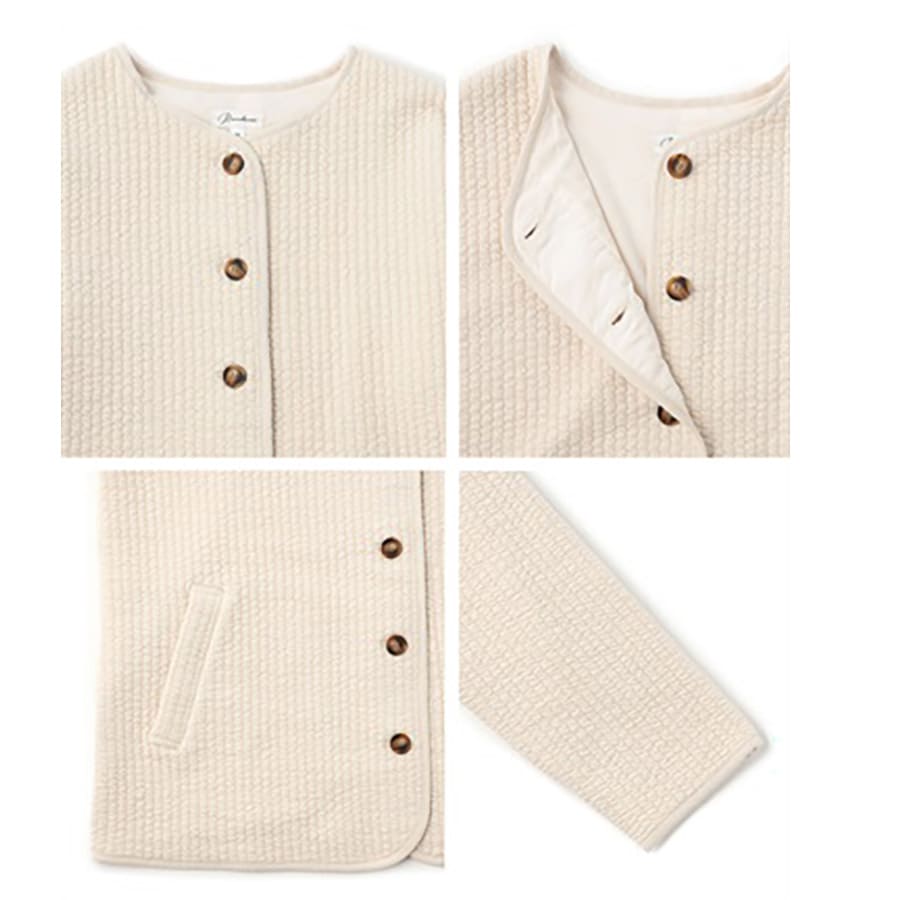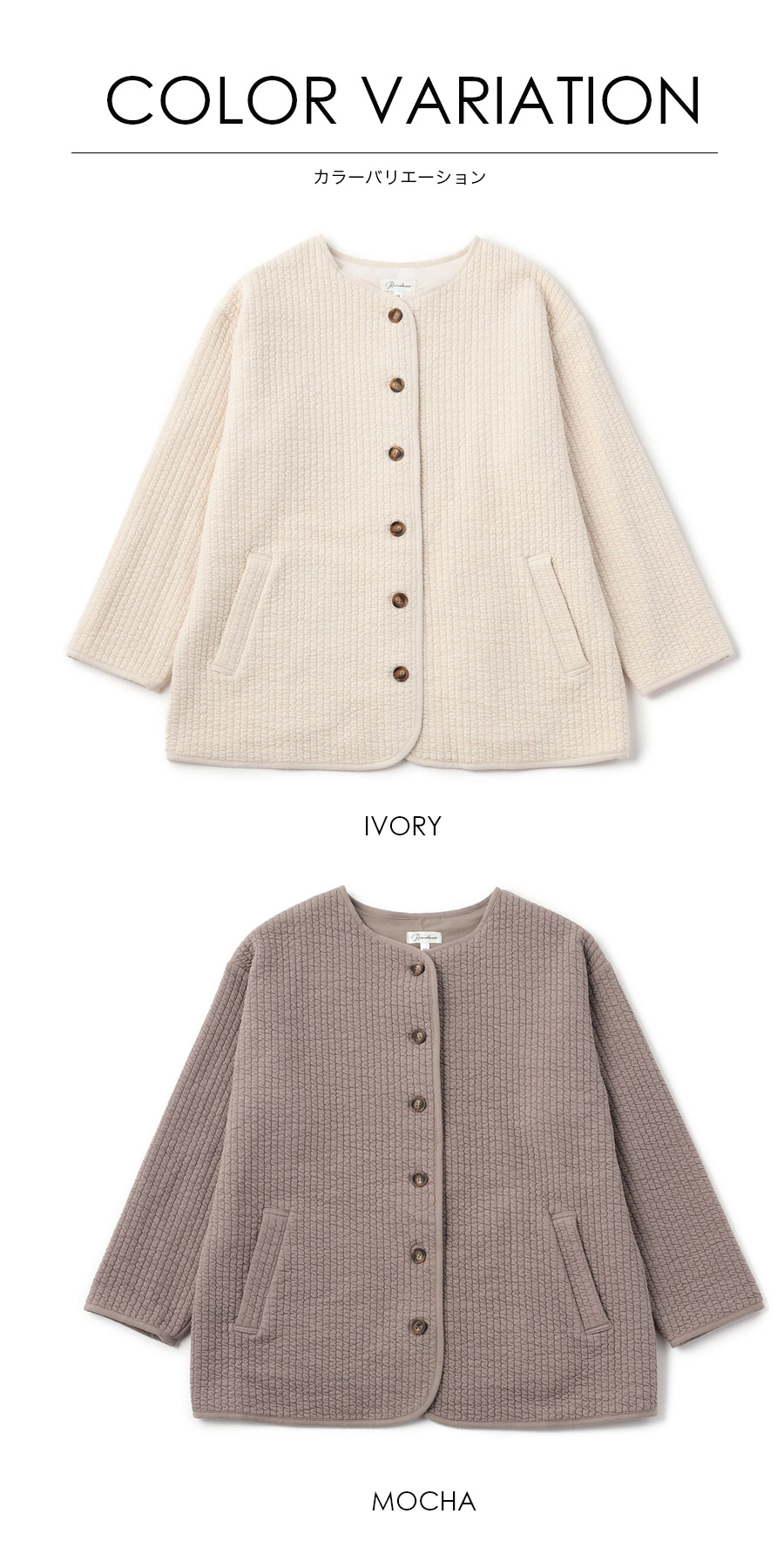 デザインは、顔まわりをすっきりと見せてくれるノーカラー仕様。