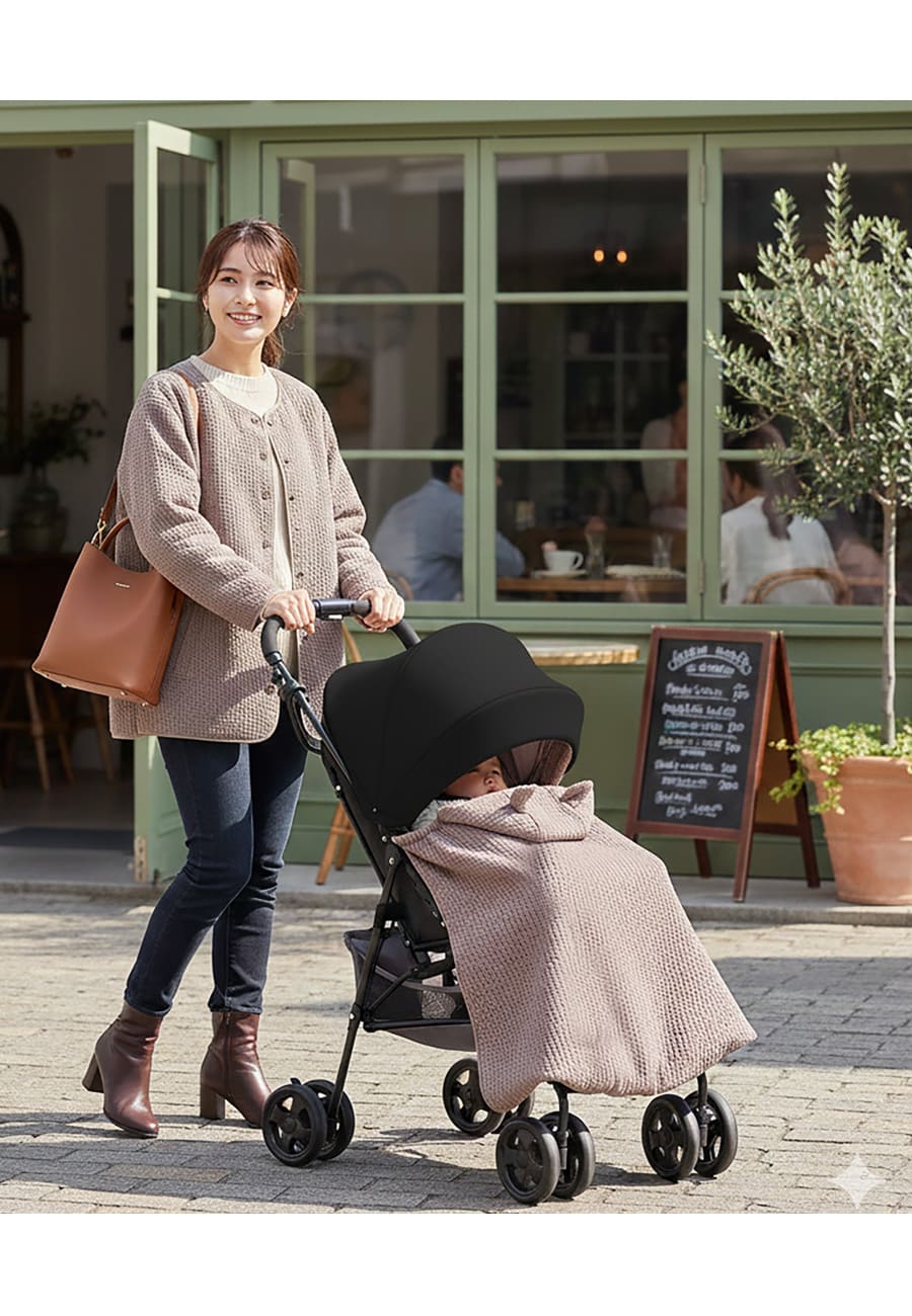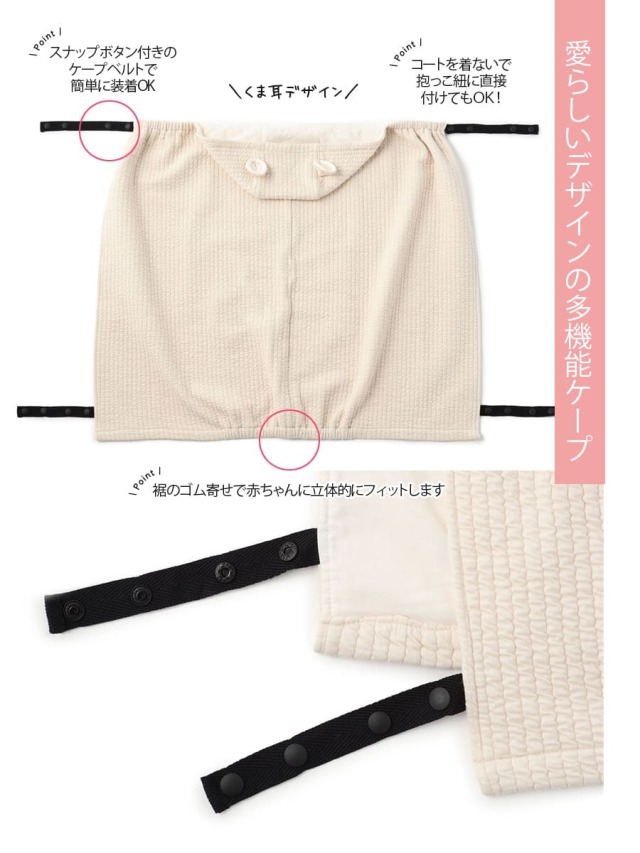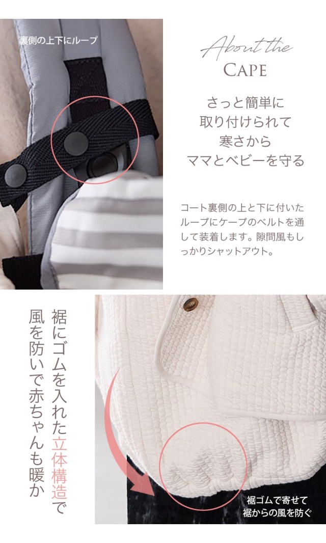 抱っこしたままでも自然に着用でき、冷たい風や外気から赤ちゃんをしっかりガードします。