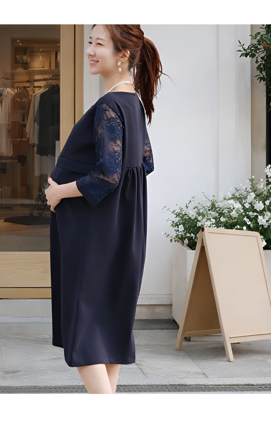 伸縮性のある厳選した美しいレースの袖は、グンと伸びるので、動きをさまたげず、育児で大変なママもストレスフリー。