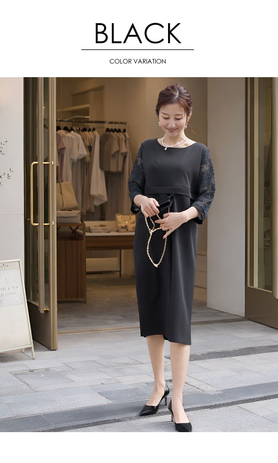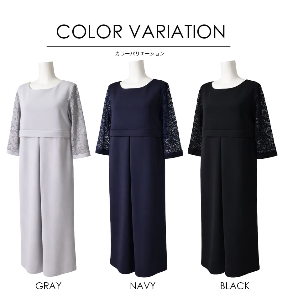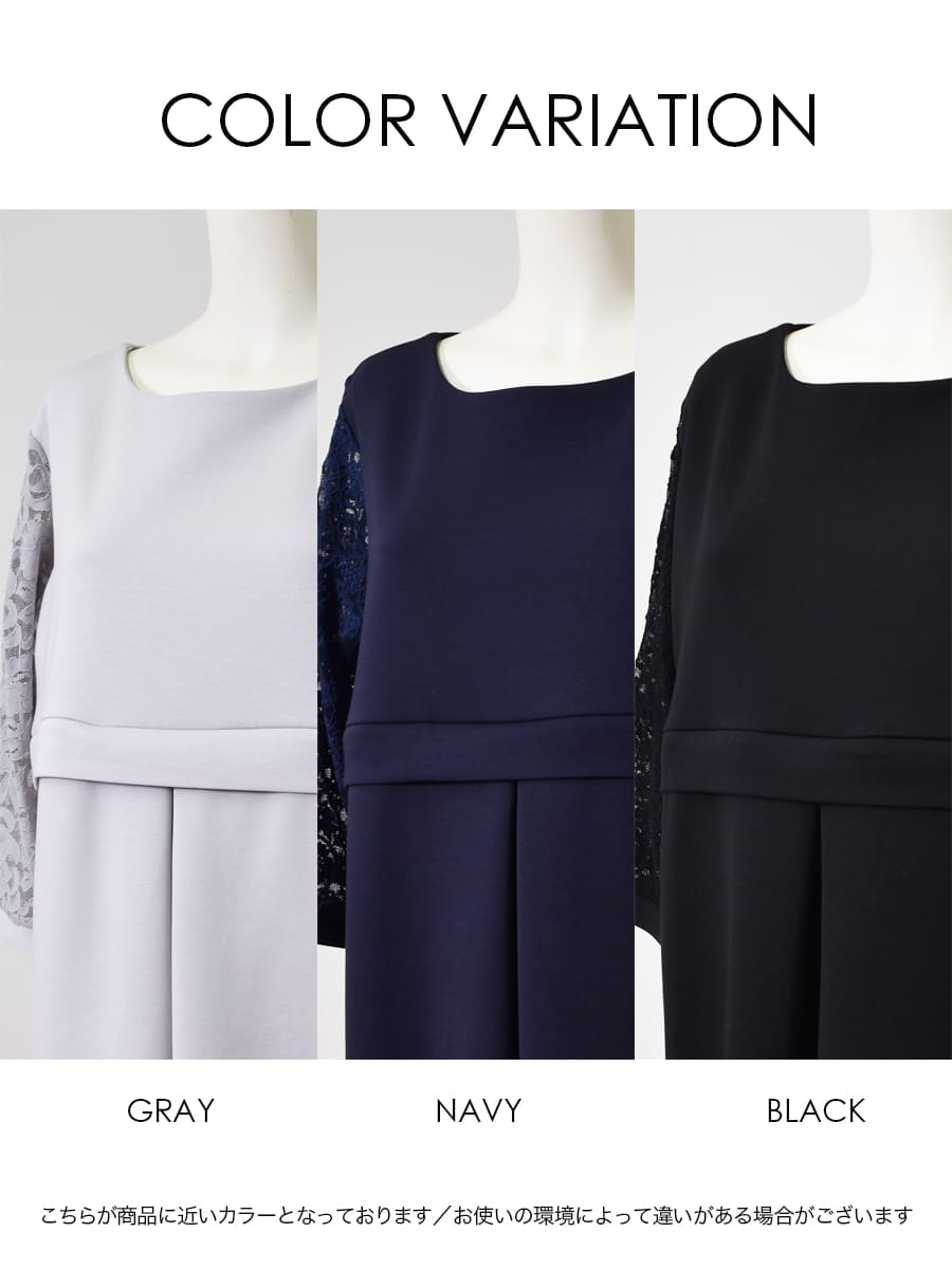 繊細で上品なストレッチレースを使ったスリーブデザインと、上品に落ちるシルエットが魅力のエレガントワンピース。