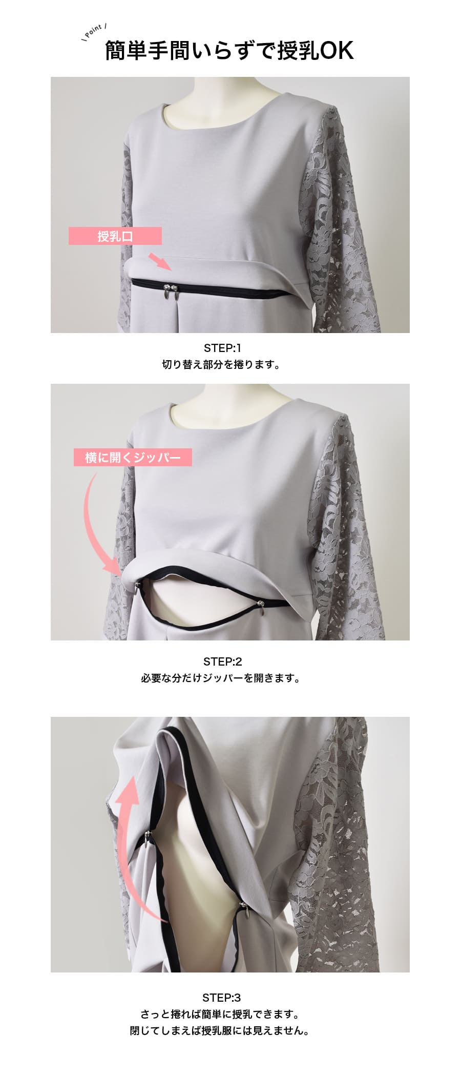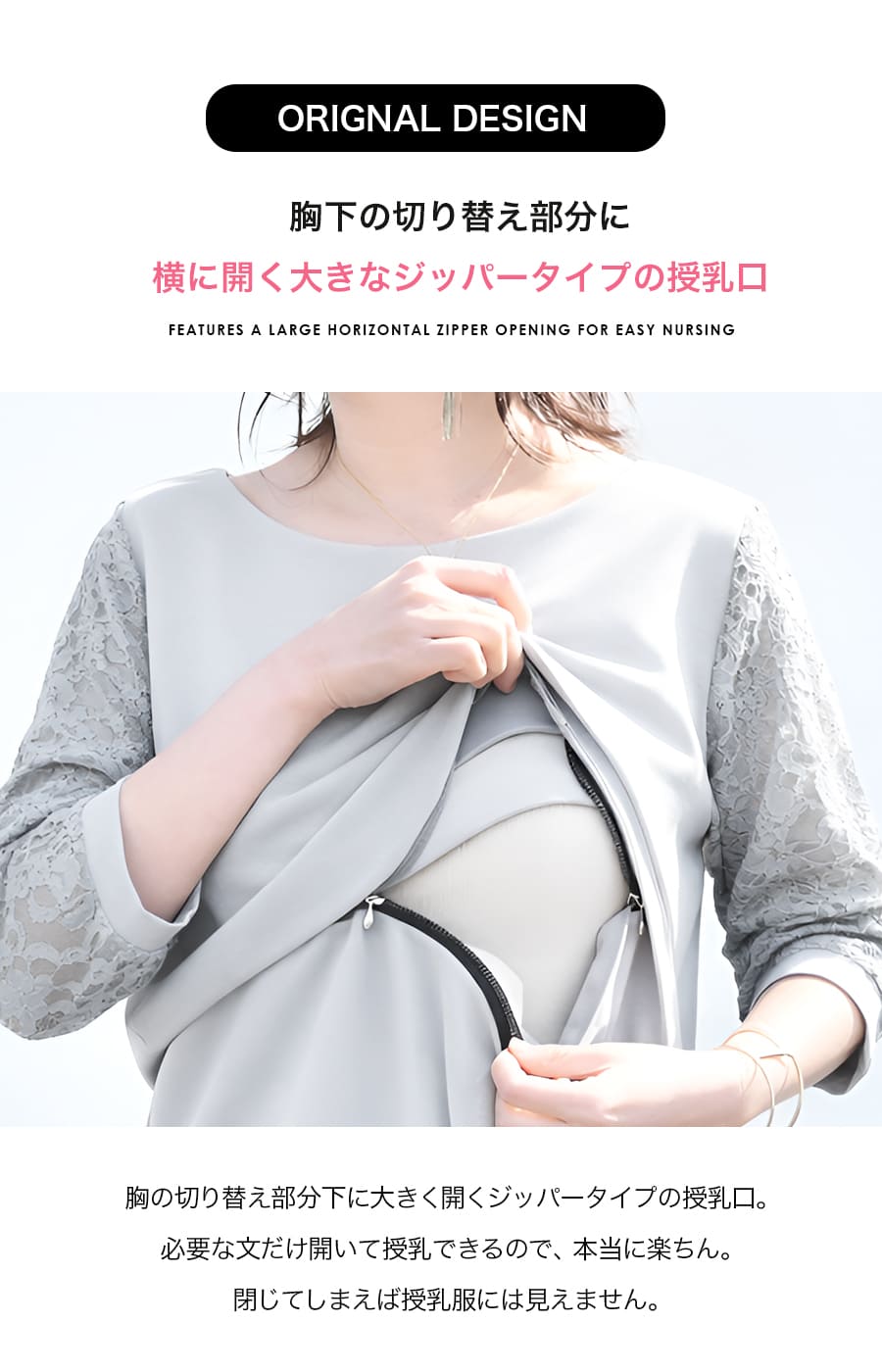 前身頃の切り替え部分につけたジッパータイプの授乳口は、左右に大きく開くのでとても授乳しやすいと授乳初めてママにも評判のデザイン。