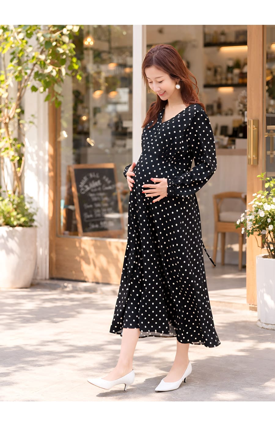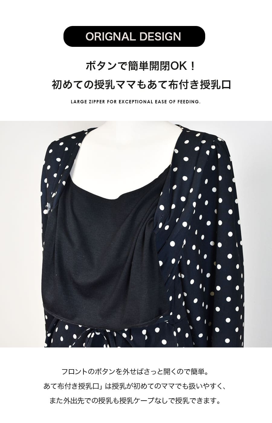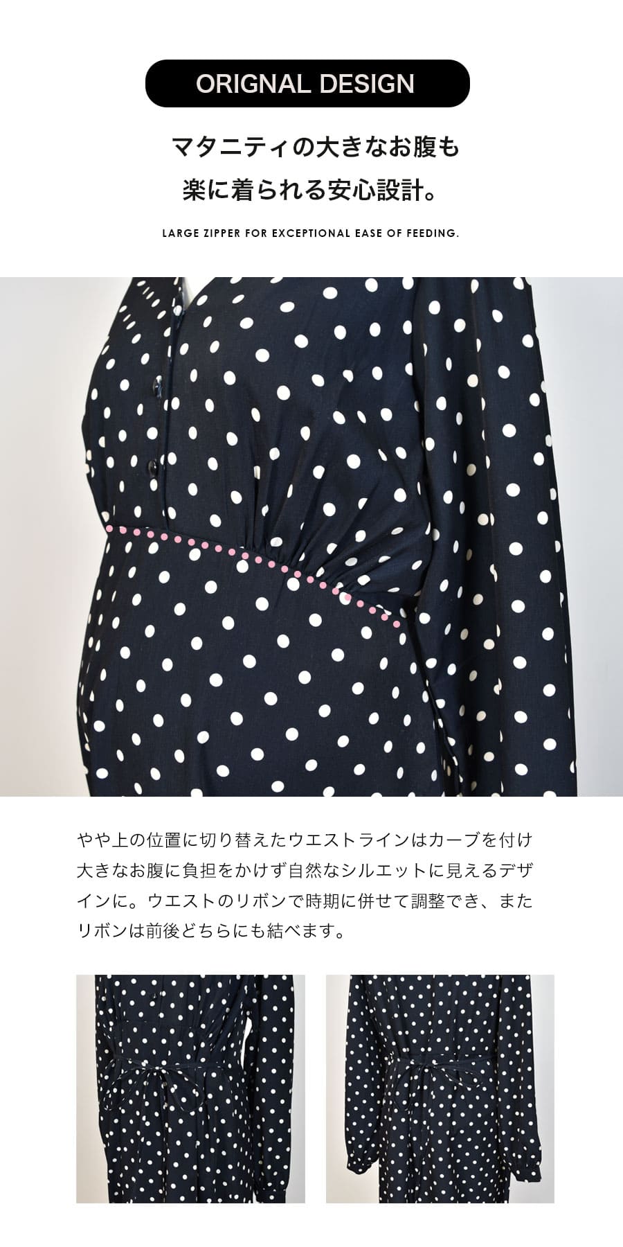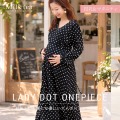 軽やかなドット柄が上品な印象をつくる、授乳対応マタニティワンピース。妊娠中の大きくなるお腹をやさしく包みながら、すっきりと女性らしいシルエットを叶える一枚です。