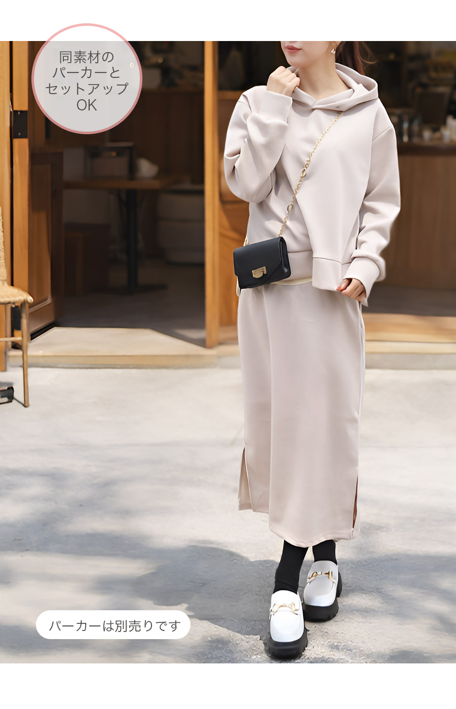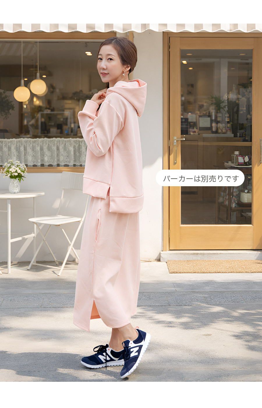 同素材のフーディーと合わせればセットアップコーデも楽しめます。