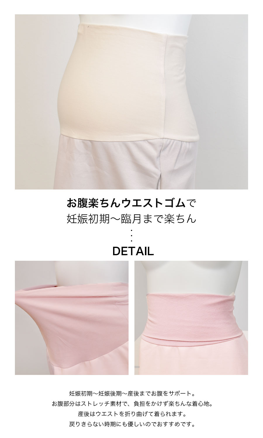 妊娠中はお腹を包み込むマタニティ仕様として、産後は折り返してすっきりとしたウエストで着られるので、産前から産後まで長く活躍します。