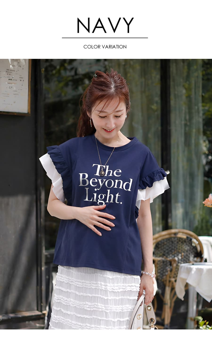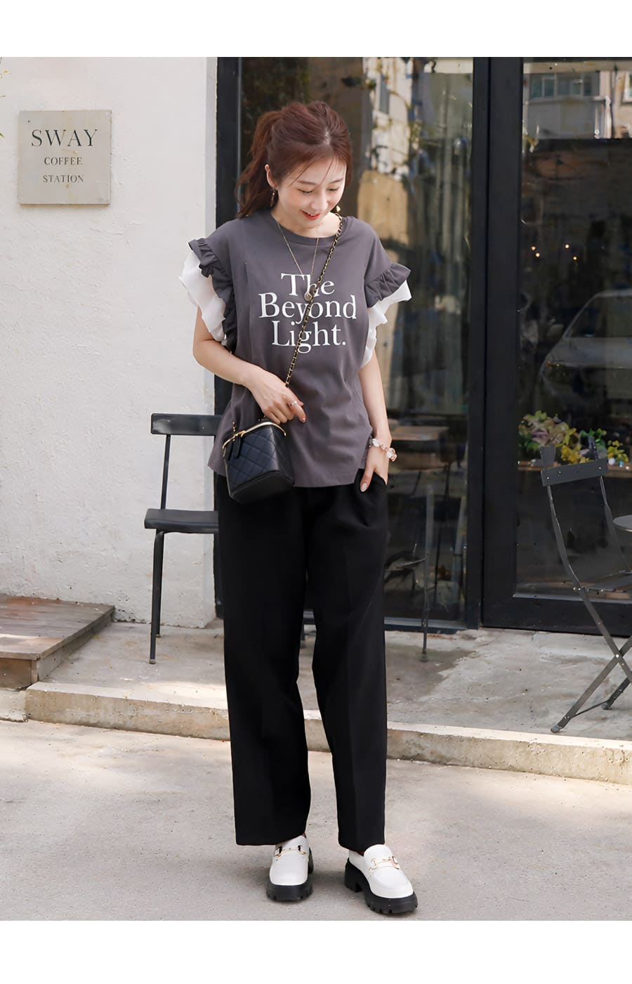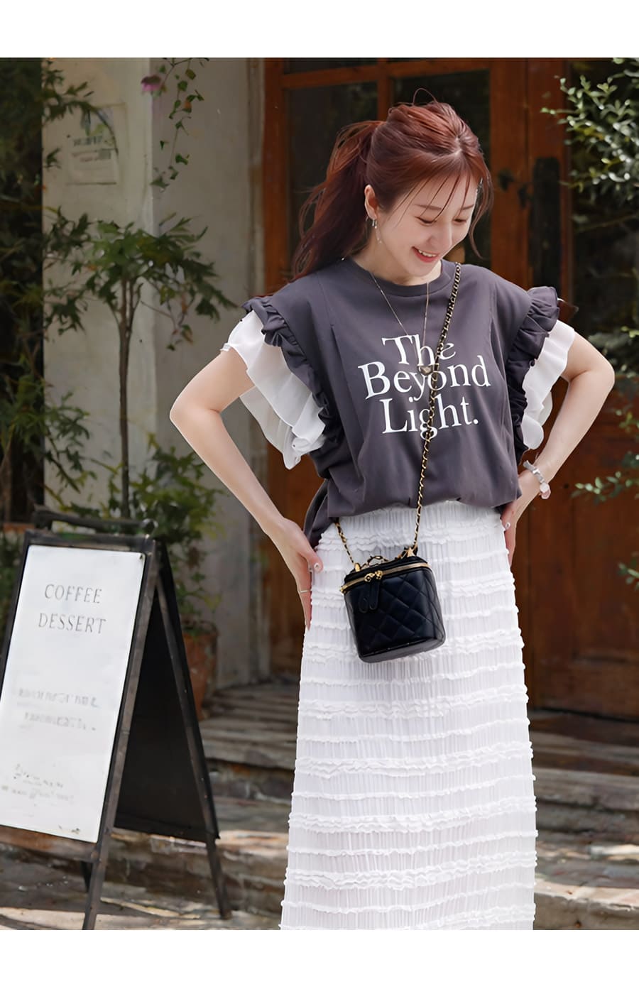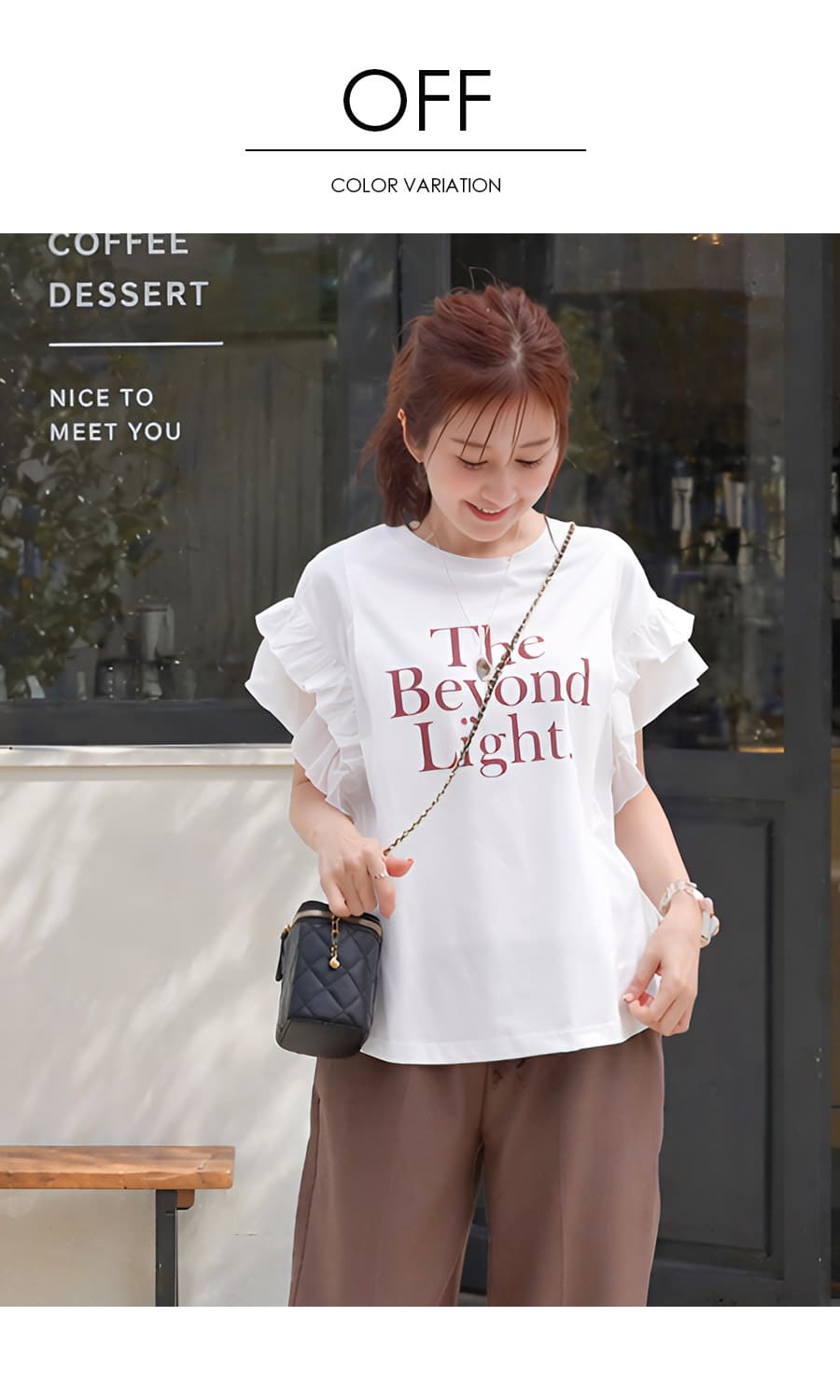 ふんわり揺れる袖フリルが目を引く、大人可愛いロゴT。