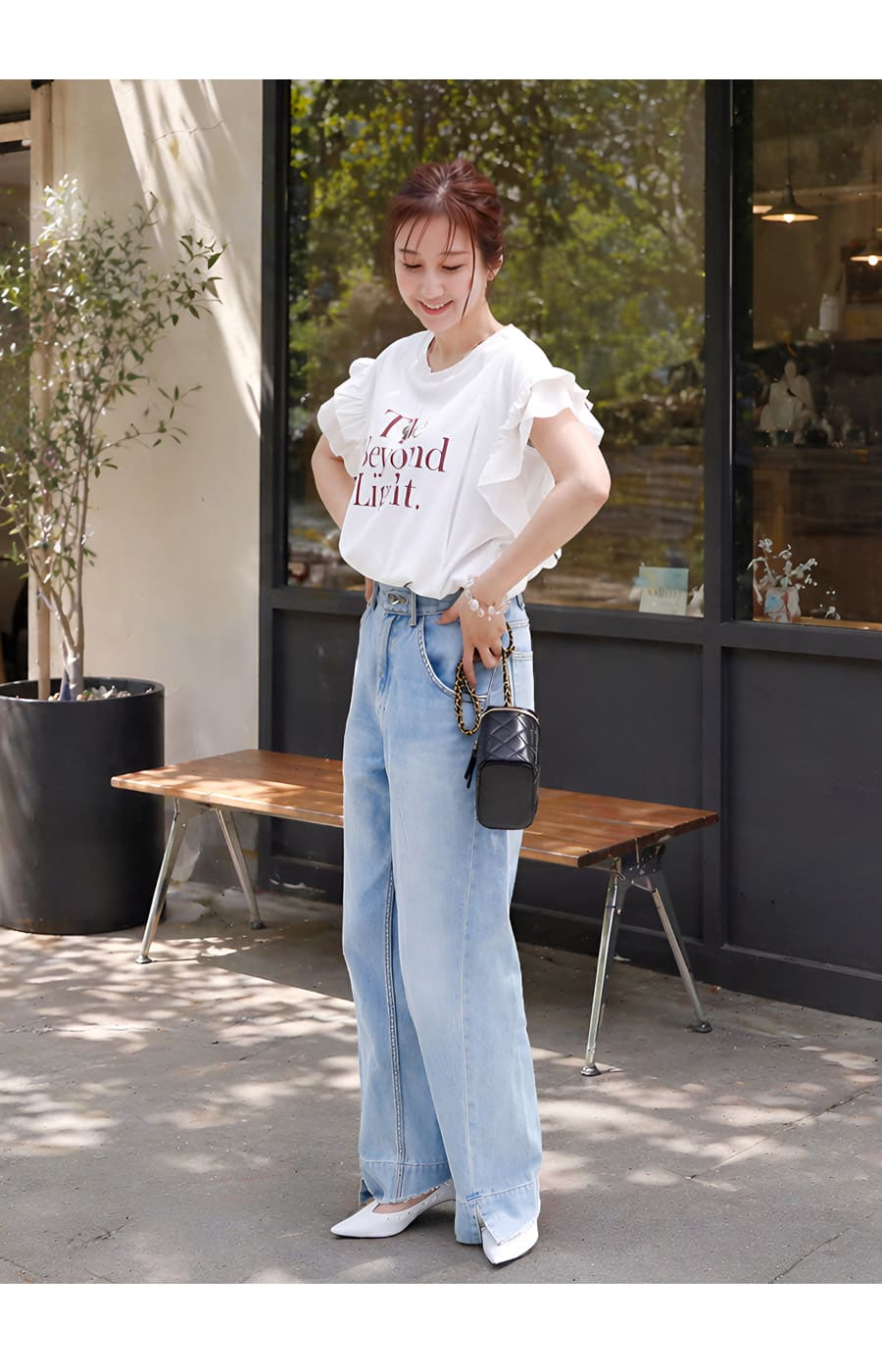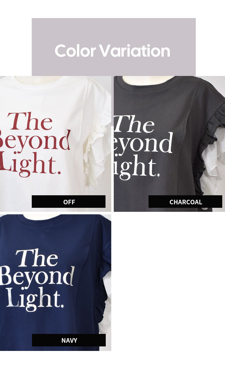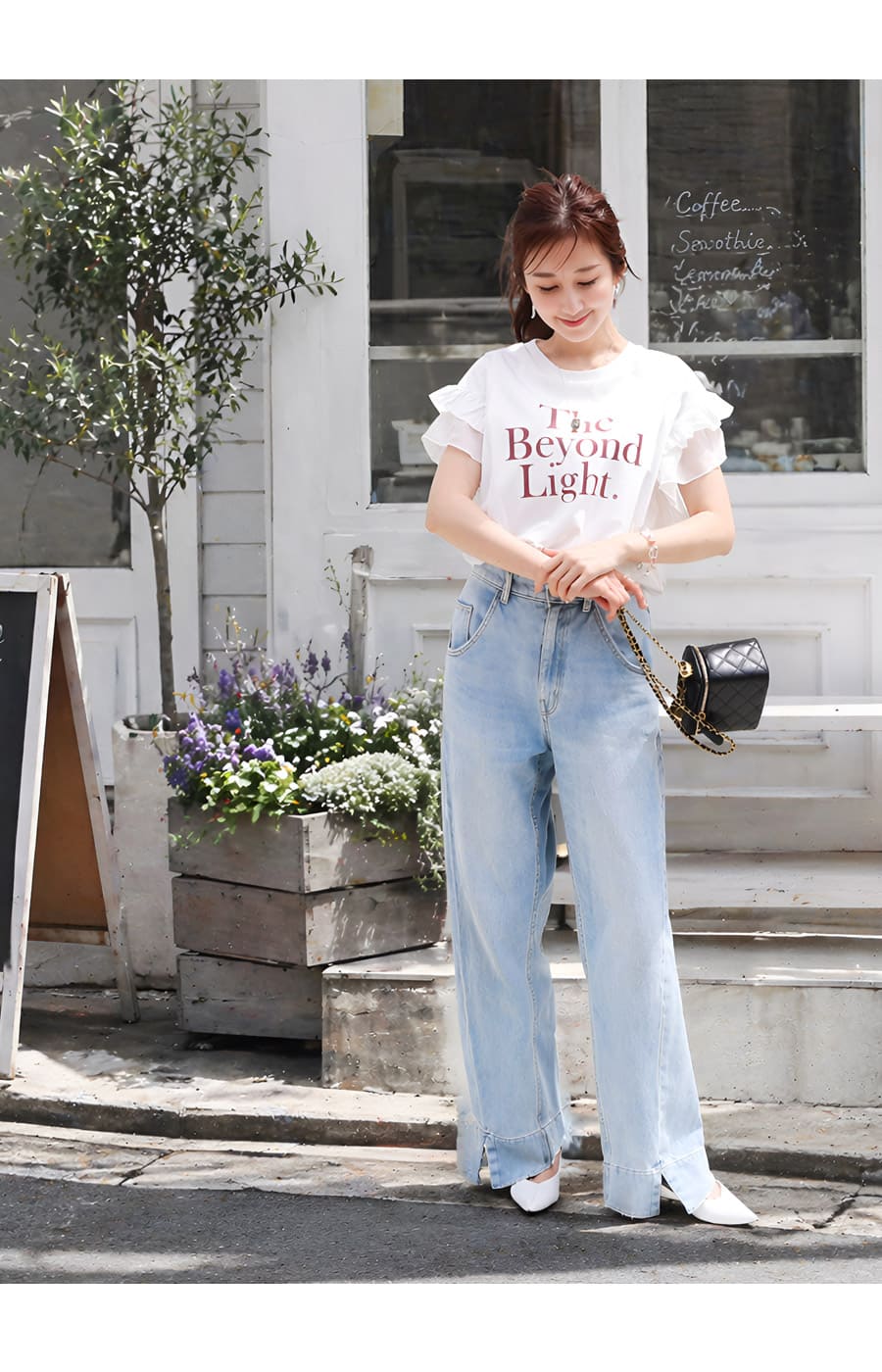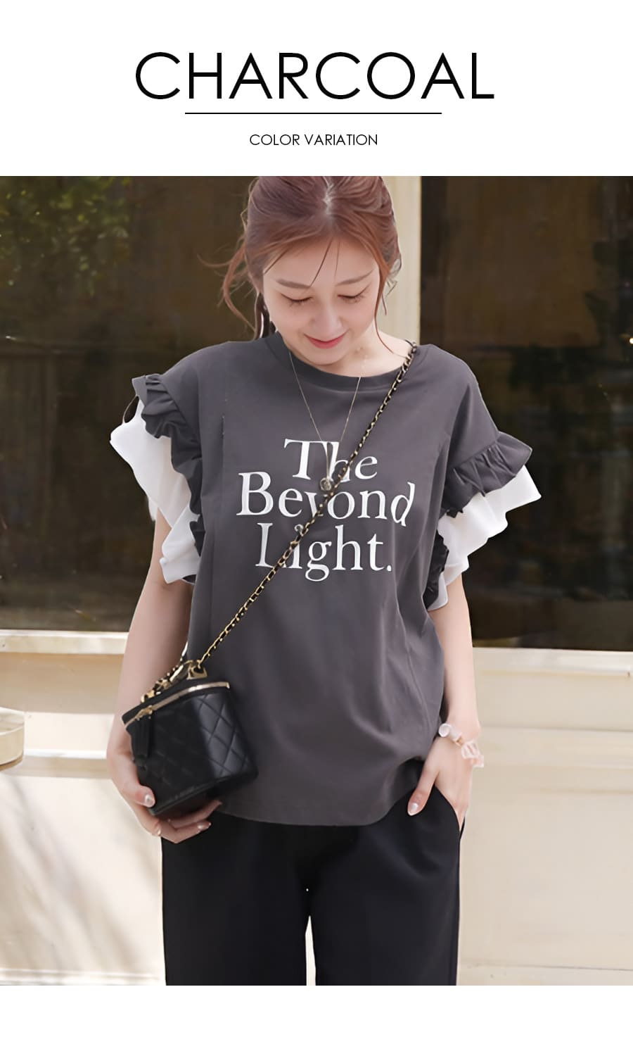 ふんわり揺れる袖フリルが目を引く、大人可愛いロゴT。