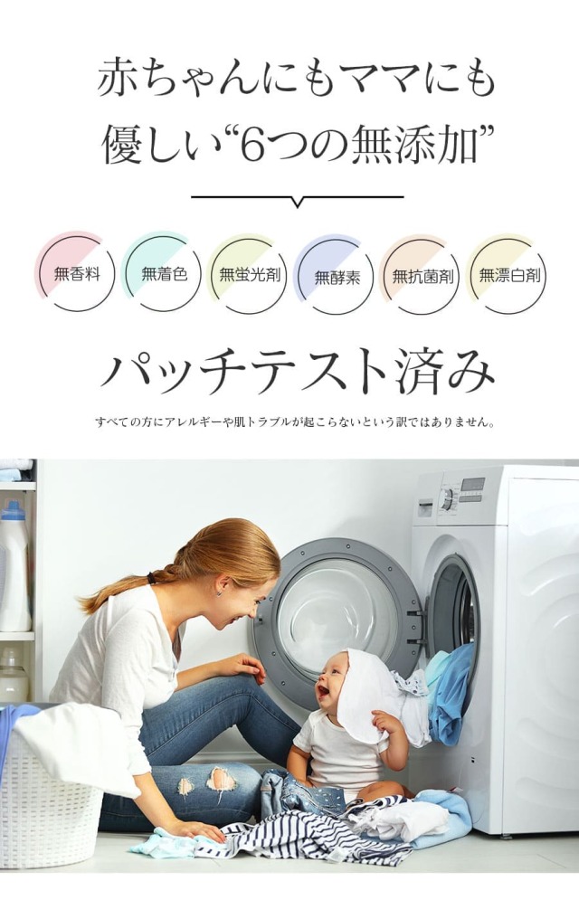 6つの無添加「無香料」「無着色」「無蛍光剤」「無酵素」「無抗菌剤」「無漂白剤」で、安心のパッチテスト済みの商品です。