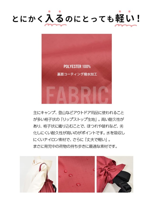 通園バッグ以外にも、はっ水加工のためキャンプやアウトドア、プール、海水浴の荷物入れにもおすすめ!