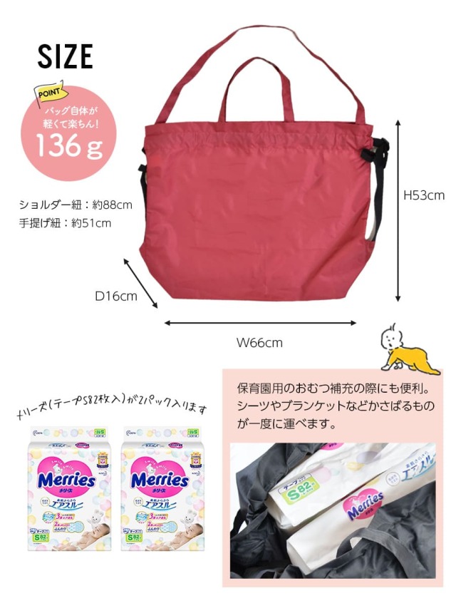 たたんだお昼寝マット、シール、ブランケット、お着替えやコップ、シューズまでたくさん入るから毎日の通園にとっても便利!