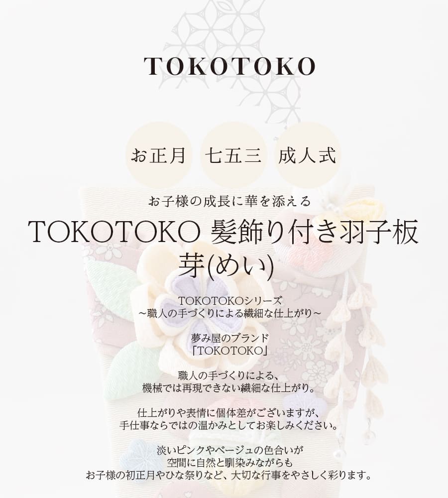 淡いピンクやベージュの色合いが、空間に自然と馴染みながらも、お子様の初正月、ひな祭りなど大切な行事をやさしく彩ります。