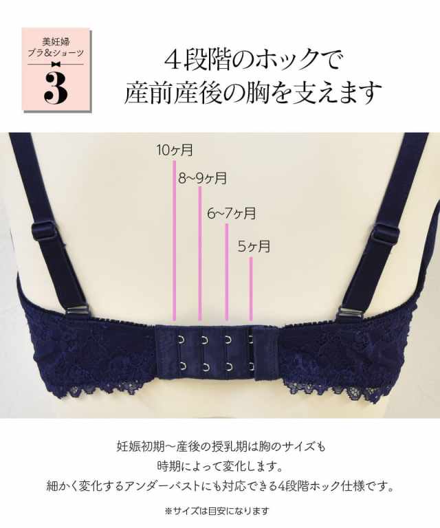 後ろのホックは妊娠期に合わせてサイズを4段階で調整でき、肩紐の調整もOK。