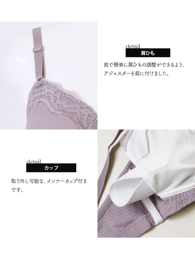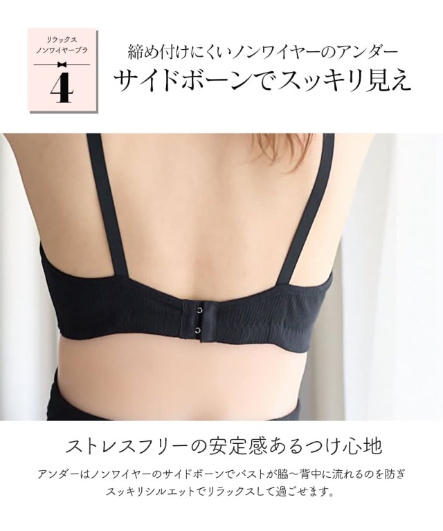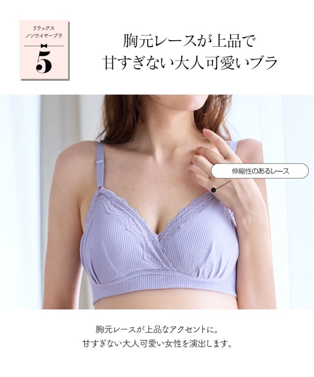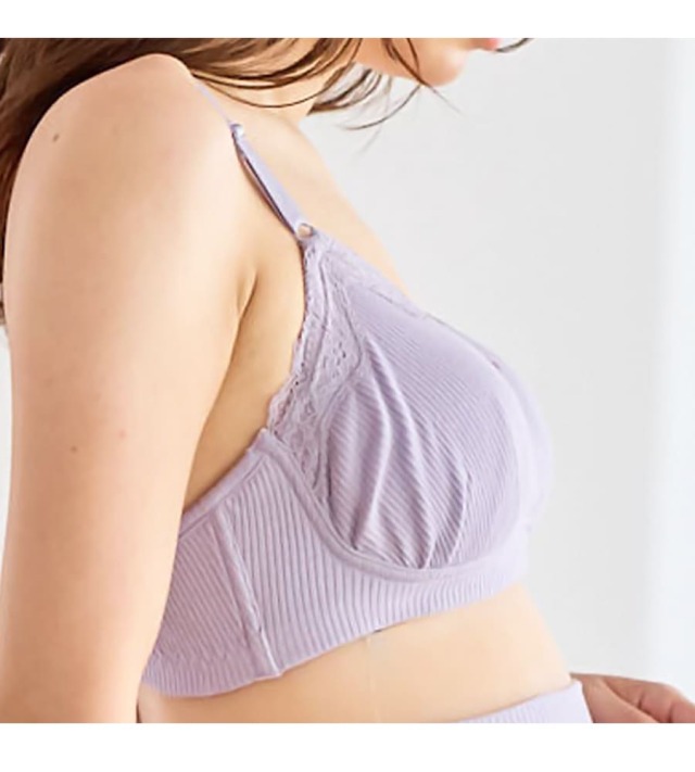 メインの素材にはぐんぐん伸びる柔らかなリブ素材を使用。ノンワイヤーで締め付け感もないからリラックスできる付け心地。
