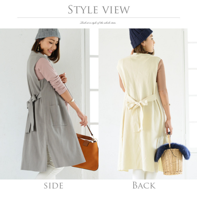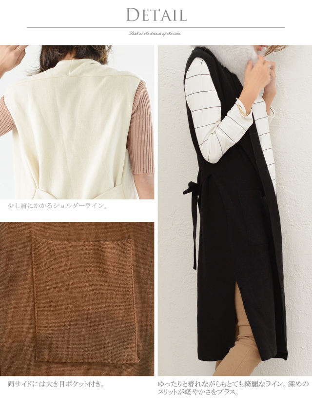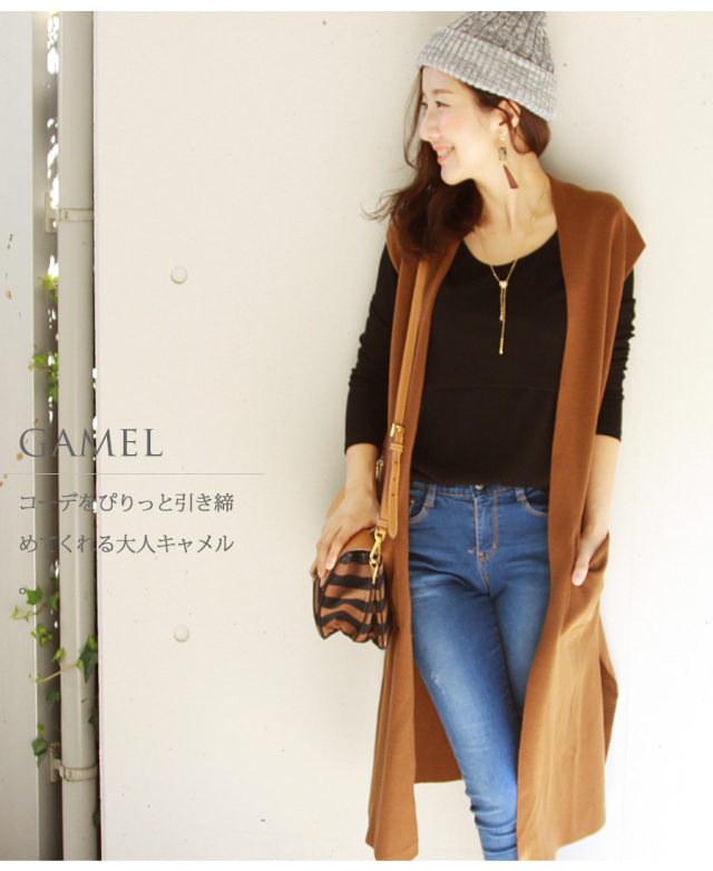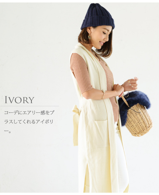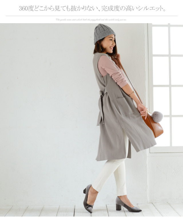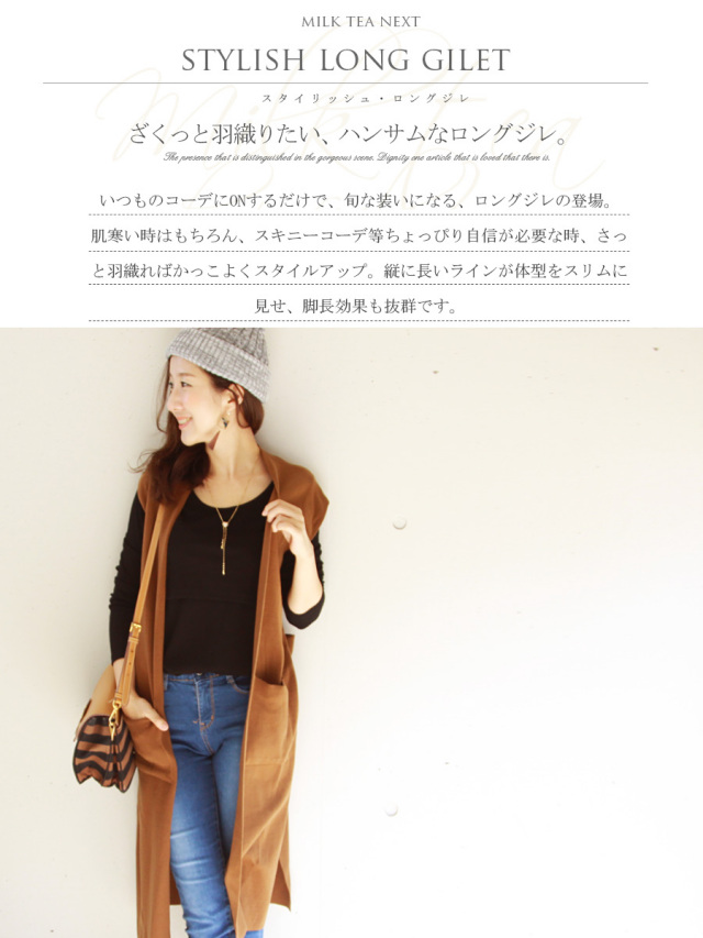 ちくちくしないニットを使った落ち感のとてもきれいなロングジレ。さっと羽織れば旬なコーデに。