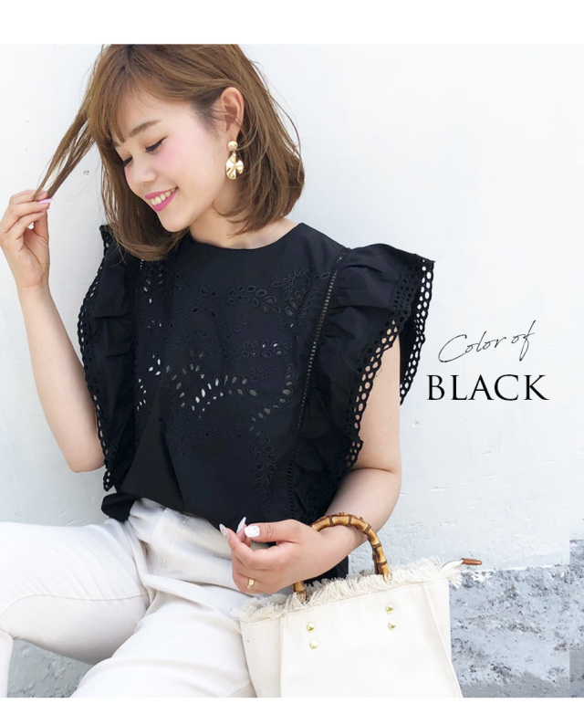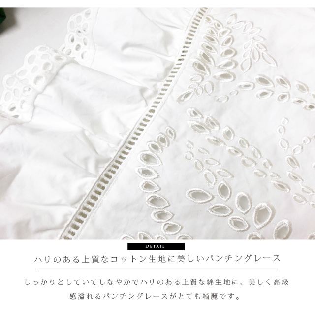 ハリとしなやかさのある上質な生地にパンチングレースを施し、ロマンティックなラッフルスリーブで仕上げました。