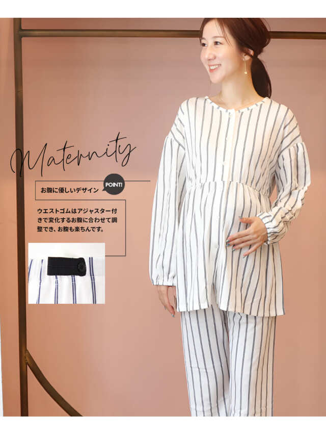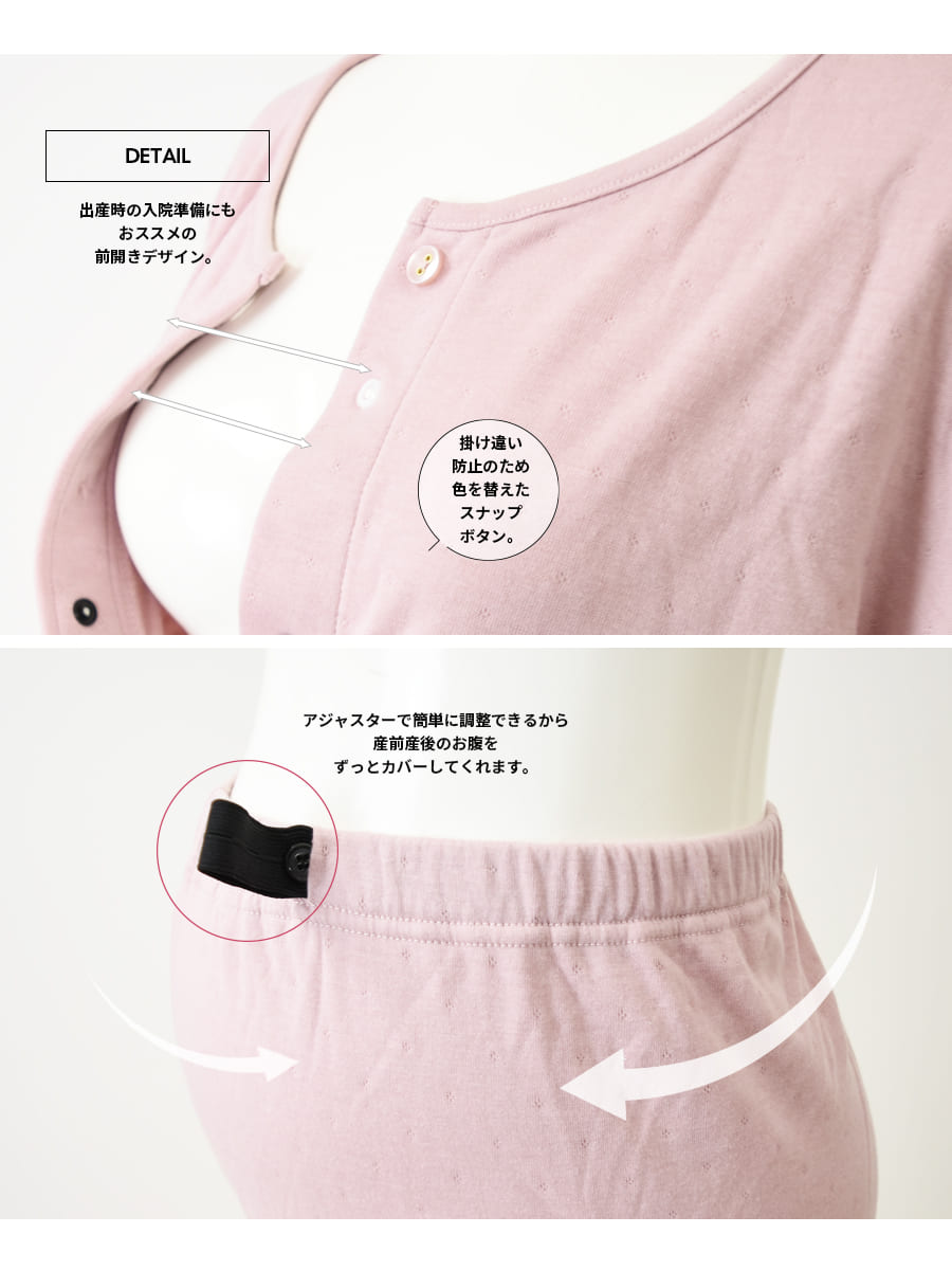 ・パンツはゴムアジャスター付きでお腹部分が調整できるので、妊娠中から産後まで、変化する体型に合わせて優しい着心地で楽ちんです。