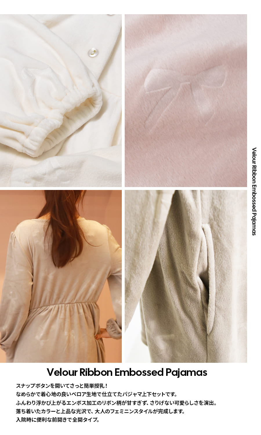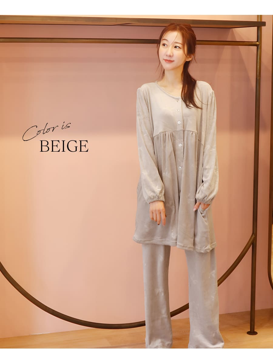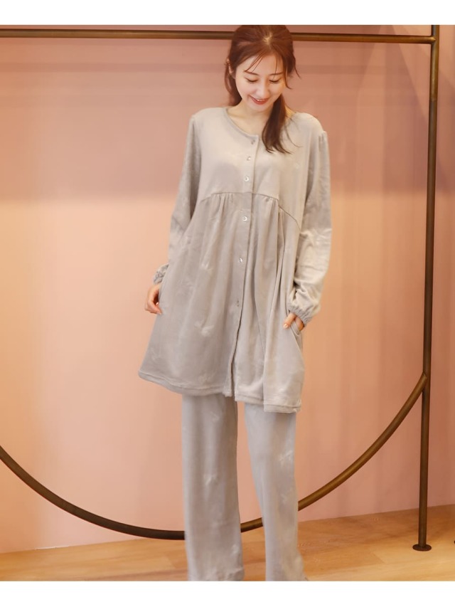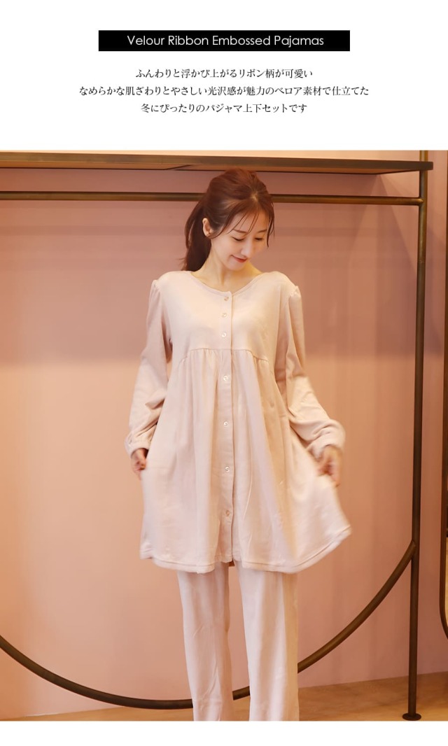 なめらかで着心地の良いベロア生地で仕立てたパジャマ上下セットです。