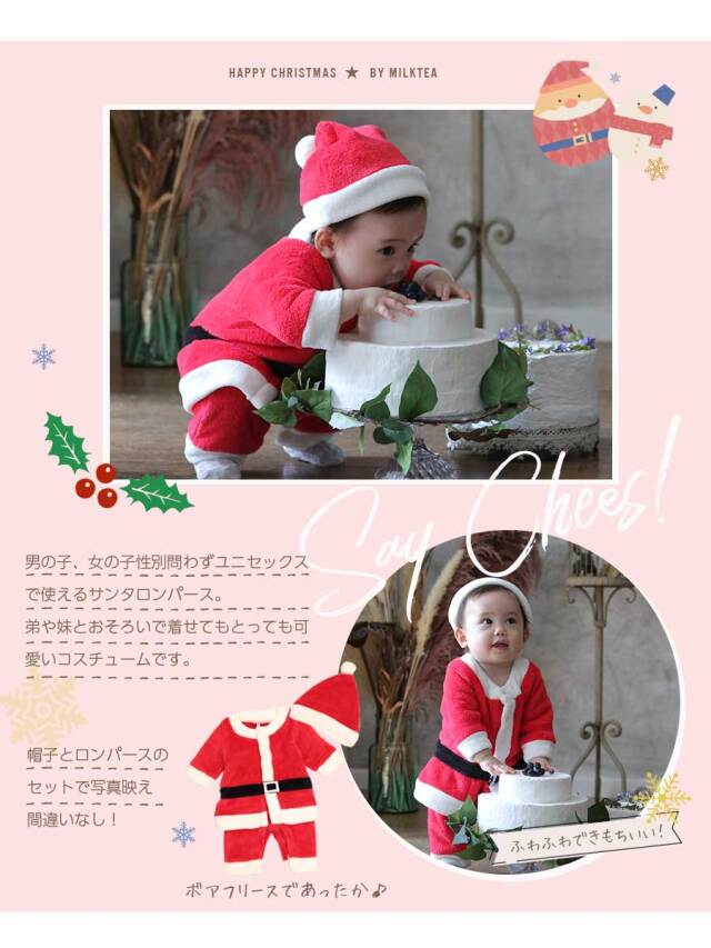 かわいいサンタさんになって、クリスマスをもっとたのしく!クリスマスもこもこロンパース&ぼうしセットが登場。