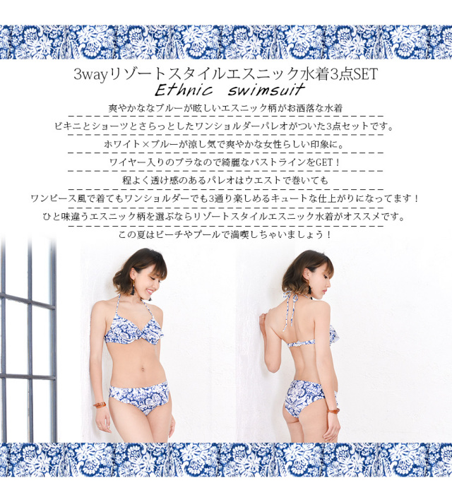 リゾートスタイルパレオ付きエスニックビキニ3点セット程よい透け感が涼し気なパレオ付でいろんな着こなしが楽しめる♪年齢不問の体型カバースイムウェア爽やかななブルーが眩しいエスニック柄がお洒落な水着ビキニとショーツとさらっとしたワンショルダーパレオがついた3点セットです。ホワイト×ブルーが涼し気で爽やかな女性らしい印象に。ブラとショーツのフリルがちょっとしたワンポイント♪ワイヤー入りのブラなので綺麗なバストラインをGET!程よく透け感のあるパレオはウエストで巻いてもワンピース風で着てもワンショルダーでも3通り楽しめるキュートな仕上がりになってます!マタニティ〜産後も着用可能です。パレオがあるので授乳の時も安心ですね。また、可愛く体型カバーも出来てひと味違うエスニック柄を選ぶならリゾートスタイルエスニック水着がオススメです。この夏はビーチやプールで満喫しちゃいましょう!
