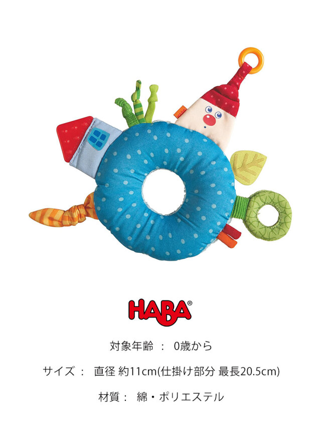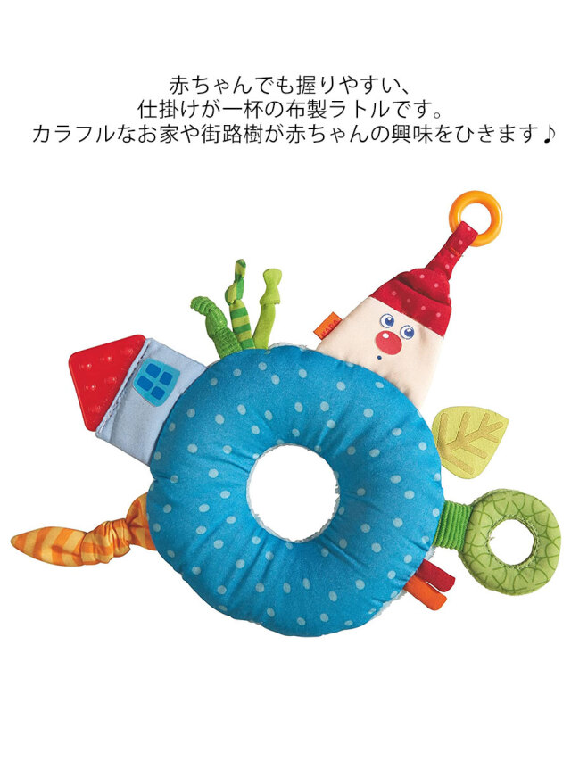 街並みをモチーフにしたHABA社のかわいいラトル、「クロースラトル・タウン」赤ちゃんでも握りやすい、仕掛けが一杯の布製ラトルです。