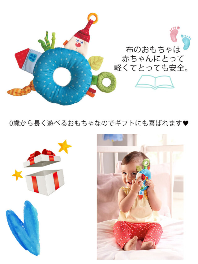 赤ちゃんでも握りやすい、仕掛けが一杯の布製ラトルです。
