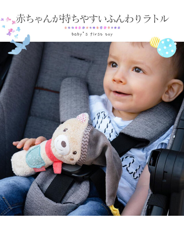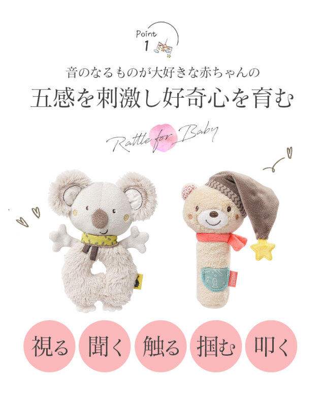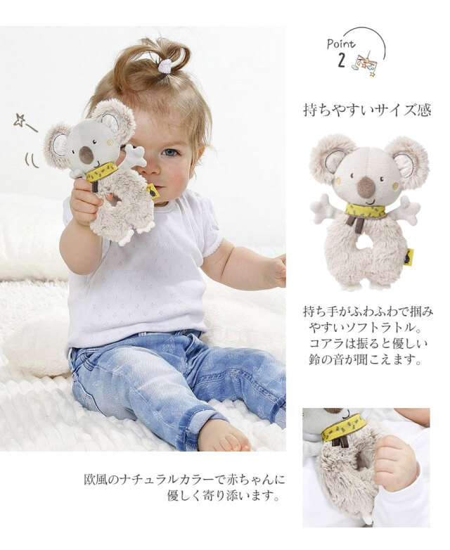 五感を刺激するラトルで赤ちゃんを笑顔に♪ 0歳からの知育玩具。 コアラとベアーのふんわりと柔らかく可愛いいラトル。 振ると鈴の音が聞こえます。 ベアーは握るとしかけの音がします。 赤ちゃんの好奇心を刺激します。 優しく柔らかな肌触りで赤ちゃんの小さな手でも遊びやすく、軽さと柔らかさが特徴です。 優しい色使いの可愛いぬいぐるみは出産祝いの贈り物にも最適です。