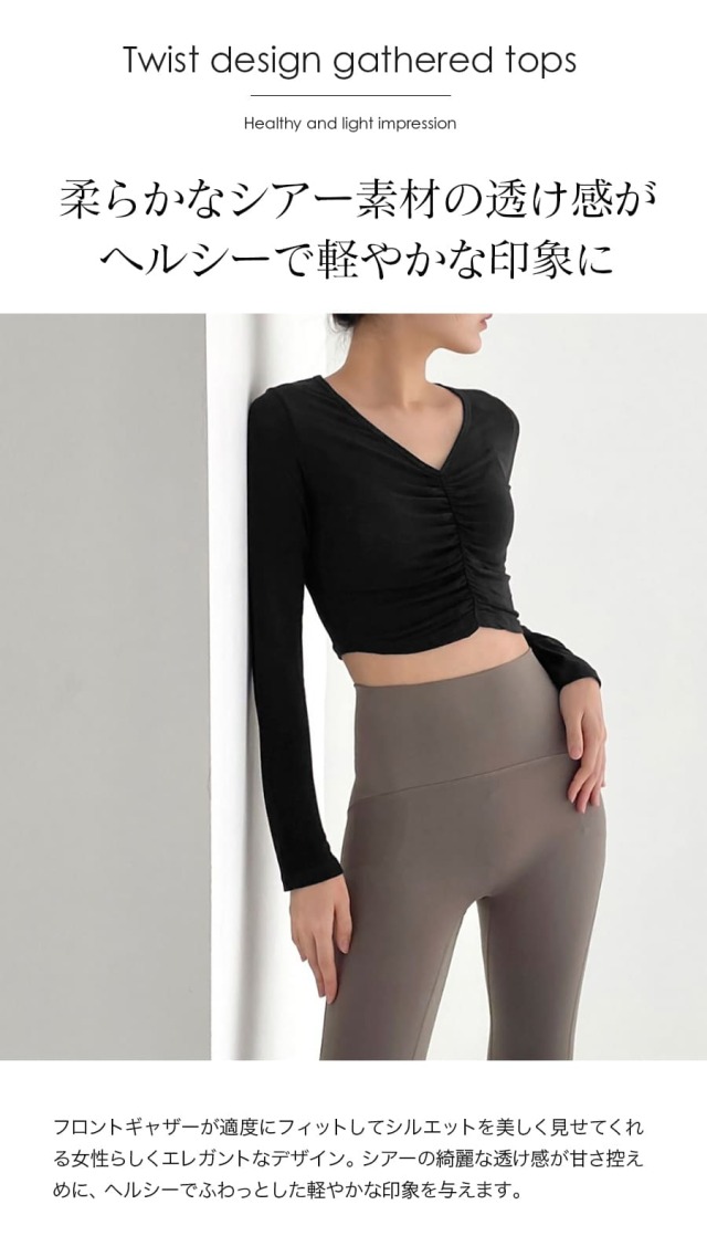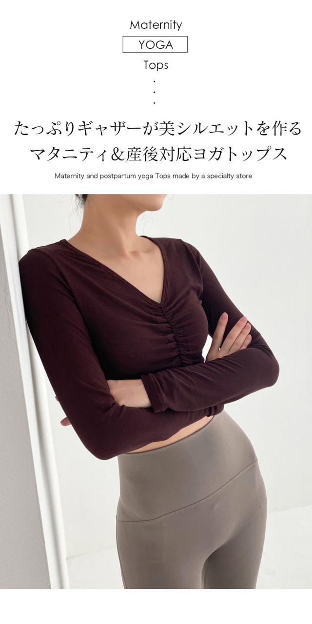 柔らかなシアー素材の透け感と、たっぷりギャザーが美シルエットを作るマタニティ&産後対応ヨガトップス