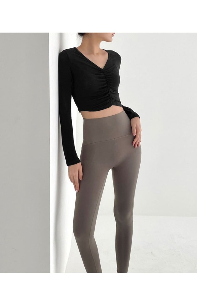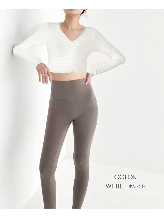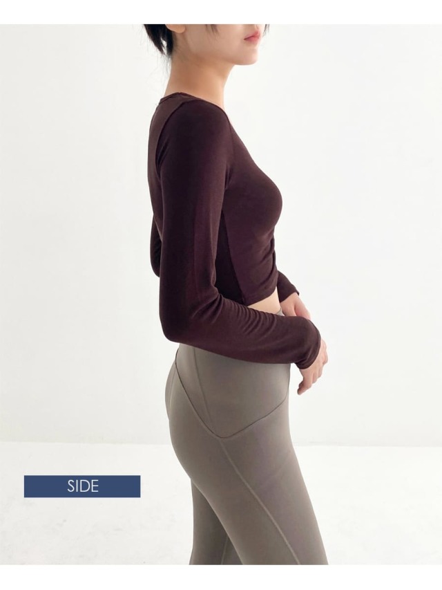 長袖タイプで二の腕ラインをカバーしながら、ワンランクアップしたフィットネスコーデに。