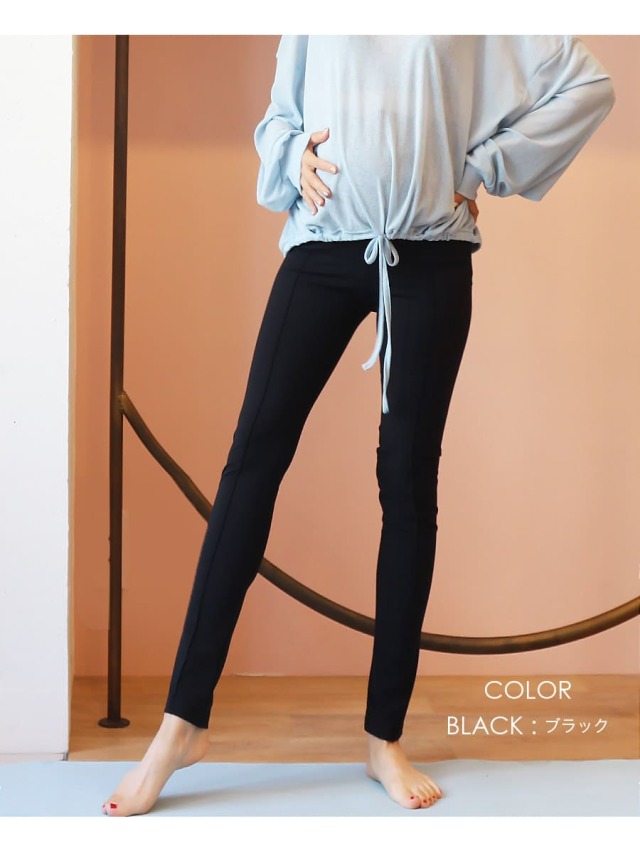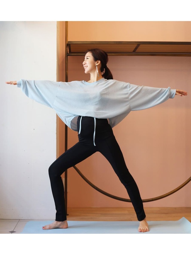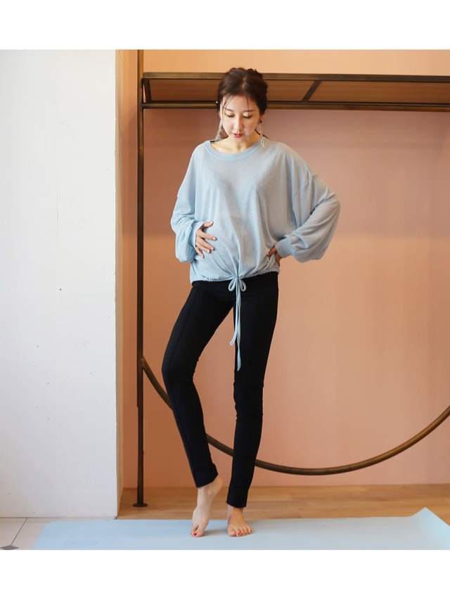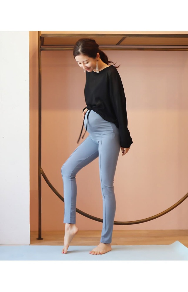 マタニティヨガはもちろん、ルームウエアとしても使え、ウエストは折り曲げてもそのままでもOK。