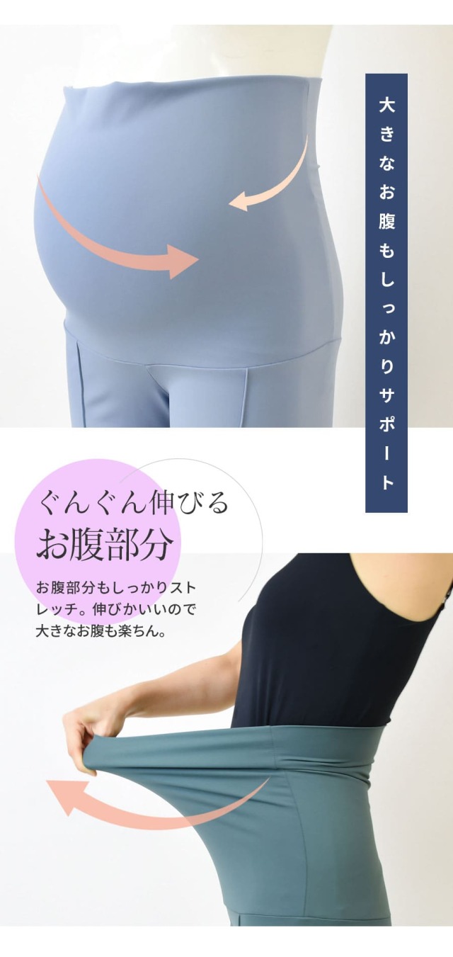 大きなお腹にフィットするサポート力抜群のウエストで、大きなお腹も楽ちんで動きやすさは抜群。